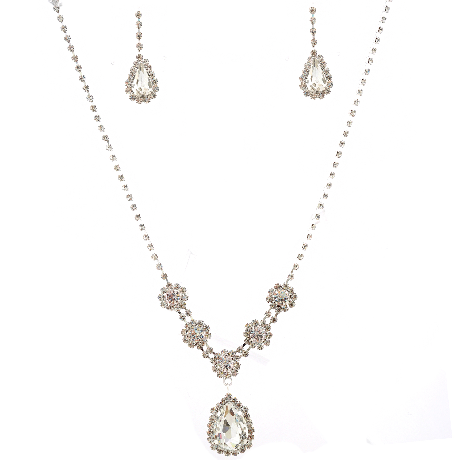 Wedding Jewelry Set Silver Crystal Dangle Necklace Earrings Set