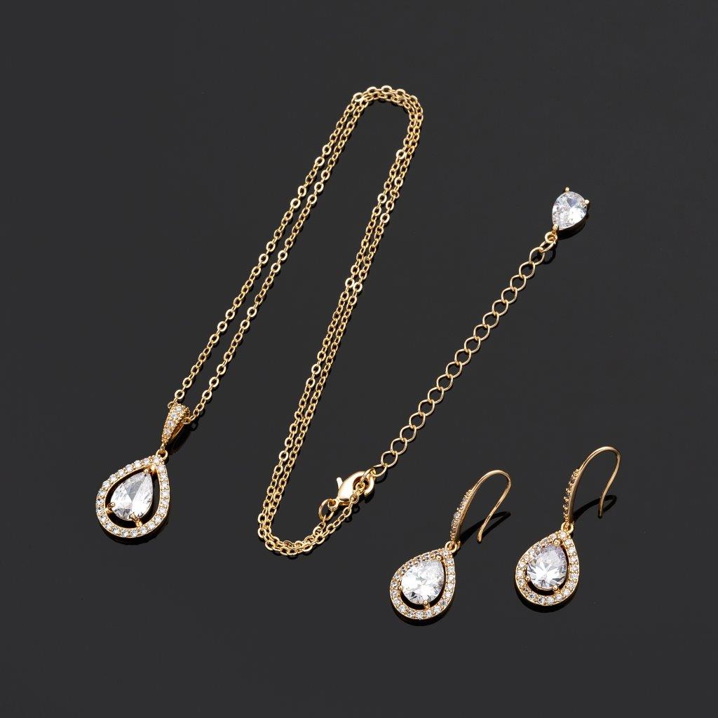 Introducing the show-stopping sensation that will have heads turning and jaws dropping – the Gold Crystal Teardrop Cubic Zirconia Necklace with a matching earring set! This exquisite jewelry set is the epitome of elegance, combining the timeless beauty of gold, the dazzling sparkle of crystals, and the brilliance of cubic zirconia.