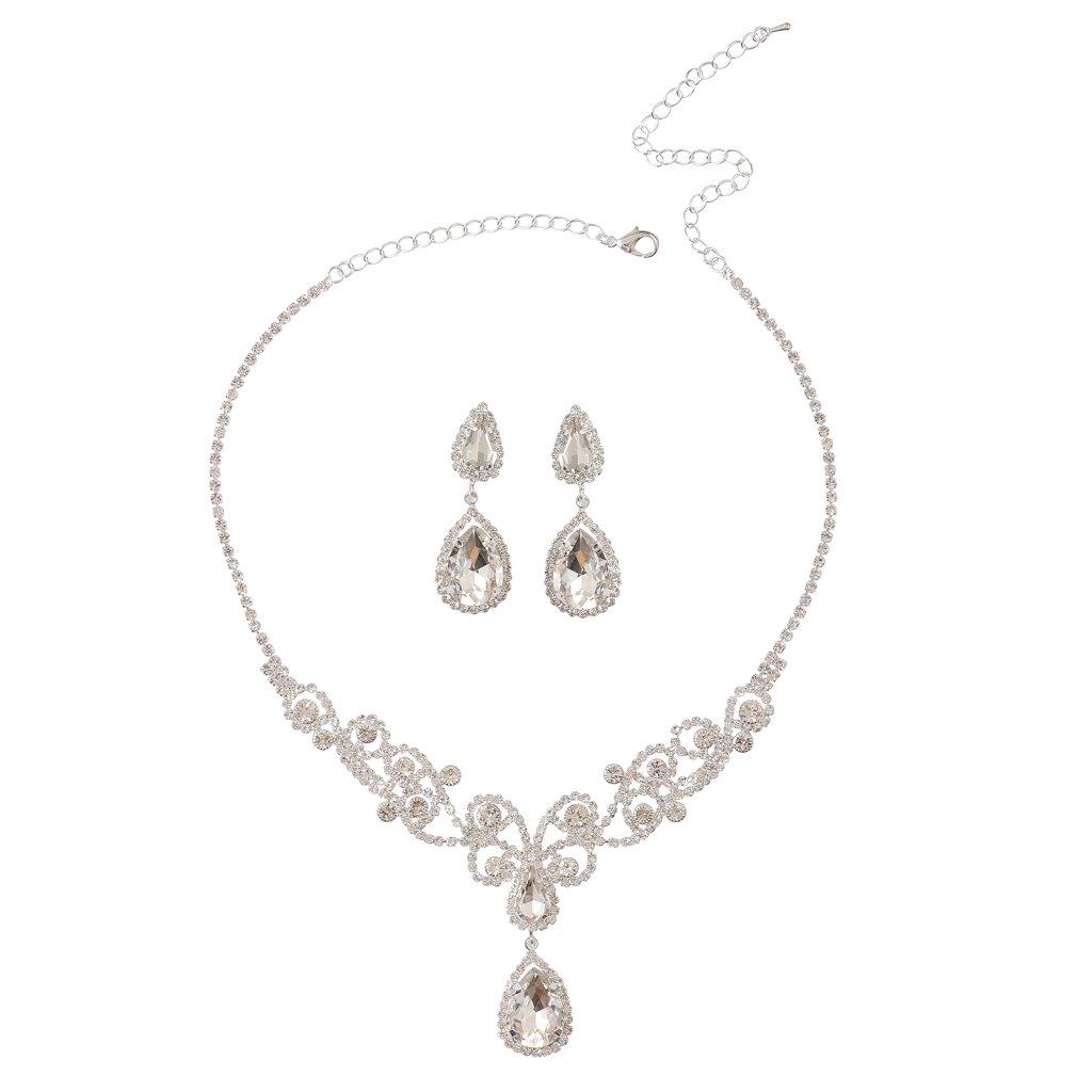 Silver Crystal Teardrop 16in Necklace with 2in Earrings Fashion Jewelry Set is an exquisite and elegant addition to your jewelry collection. This stunning set features a necklace and a pair of earrings, both adorned with shimmering silver crystals and rhinestones that exude sophistication and style.