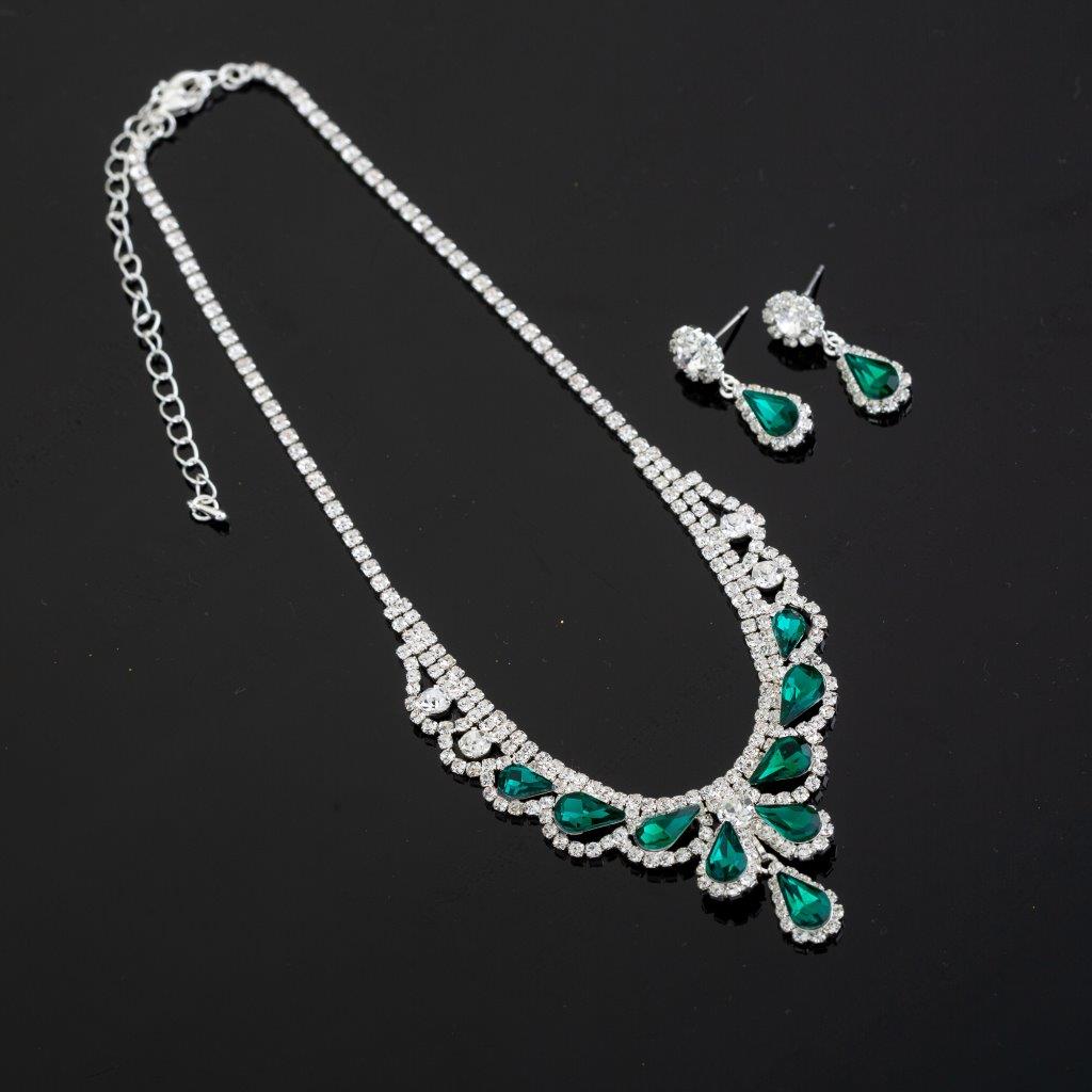 Crafted with meticulous attention to detail, this jewelry set features a captivating emerald green teardrop pendant suspended from a delicate silver chain. The pendant is adorned with mesmerizing emerald green crystals that beautifully catch the light, creating a dazzling display of radiance. Complete the look with the matching emerald green earrings, designed to perfectly complement the necklace.