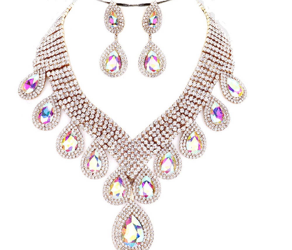 Elevate your style with our Gold AB Crystals Teardrop Necklace and Earrings set. With its stunning design and versatility, this jewelry set is a must-have for any fashion-forward individual. Order yours today and enjoy the beauty and sophistication it brings to your wardrobe.
