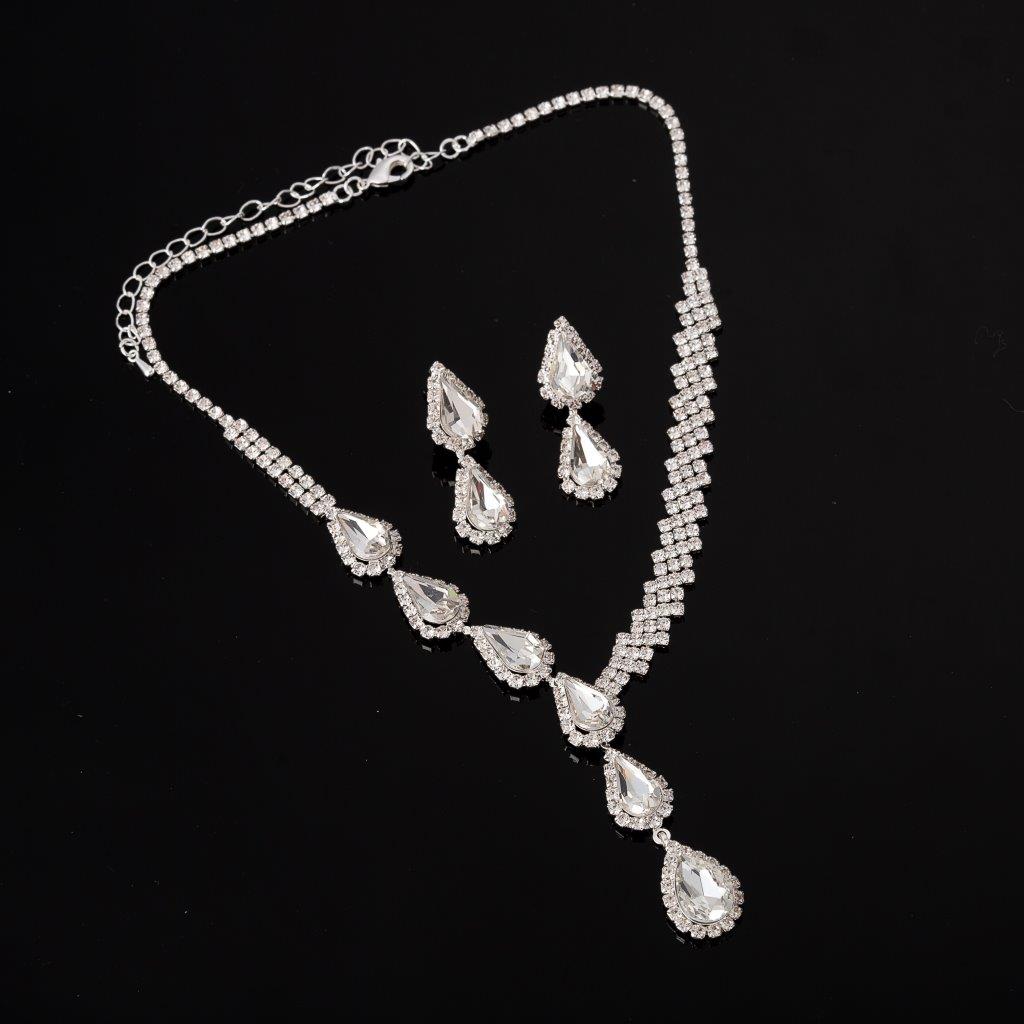 Prepare to be dazzled by the exquisite combination of shimmering silver, glistening crystals, and rhinestones in this one-of-a-kind necklace and earrings set. The timeless beauty of the teardrop shape is accentuated by the intricate detailing, creating a look that simply exudes sophistication.
