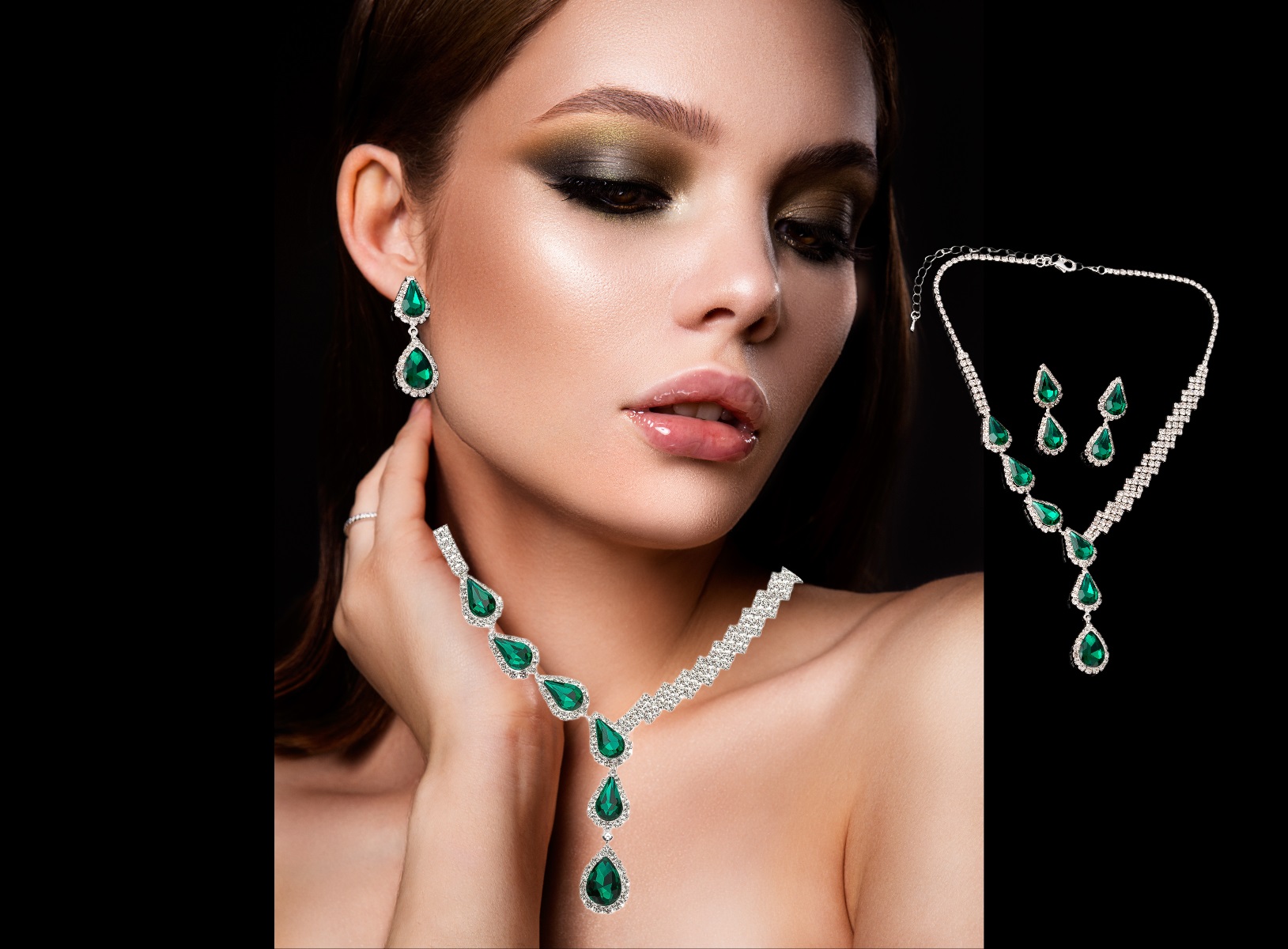Accompanying the necklace are exquisite teardrop earrings that match its dazzling design. Crafted with precision, these earrings feature emerald green rhinestones that shimmer and shine with every movement. Their delicate and striking design effortlessly completes the ensemble, making it the perfect choice for any occasion.