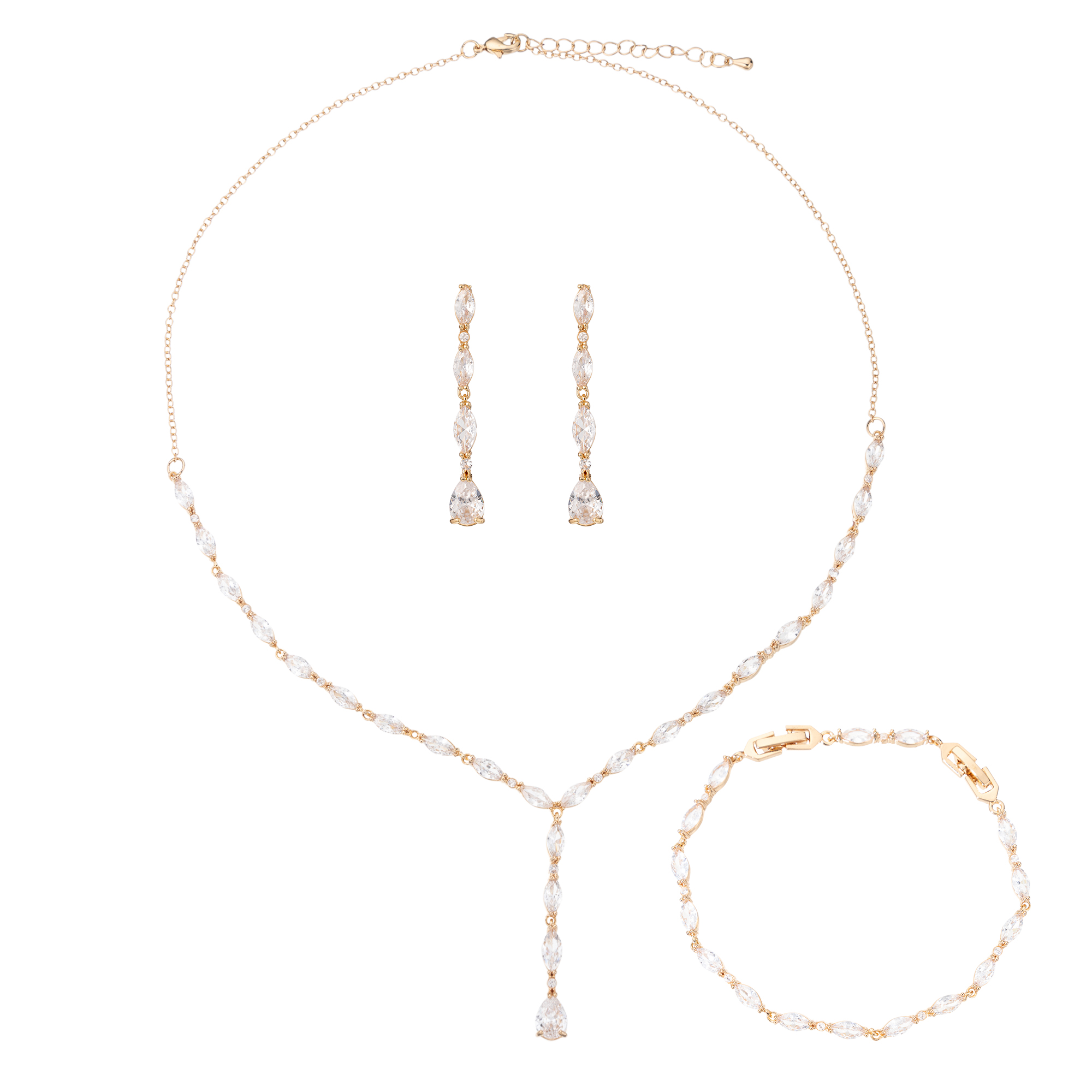 The single-strand accent necklace is the focal point of this set, drawing attention to your neckline and adding a touch of allure to your appearance. The coordinating earrings and bracelet complete the look, creating a harmonious ensemble that exudes charm and grace.