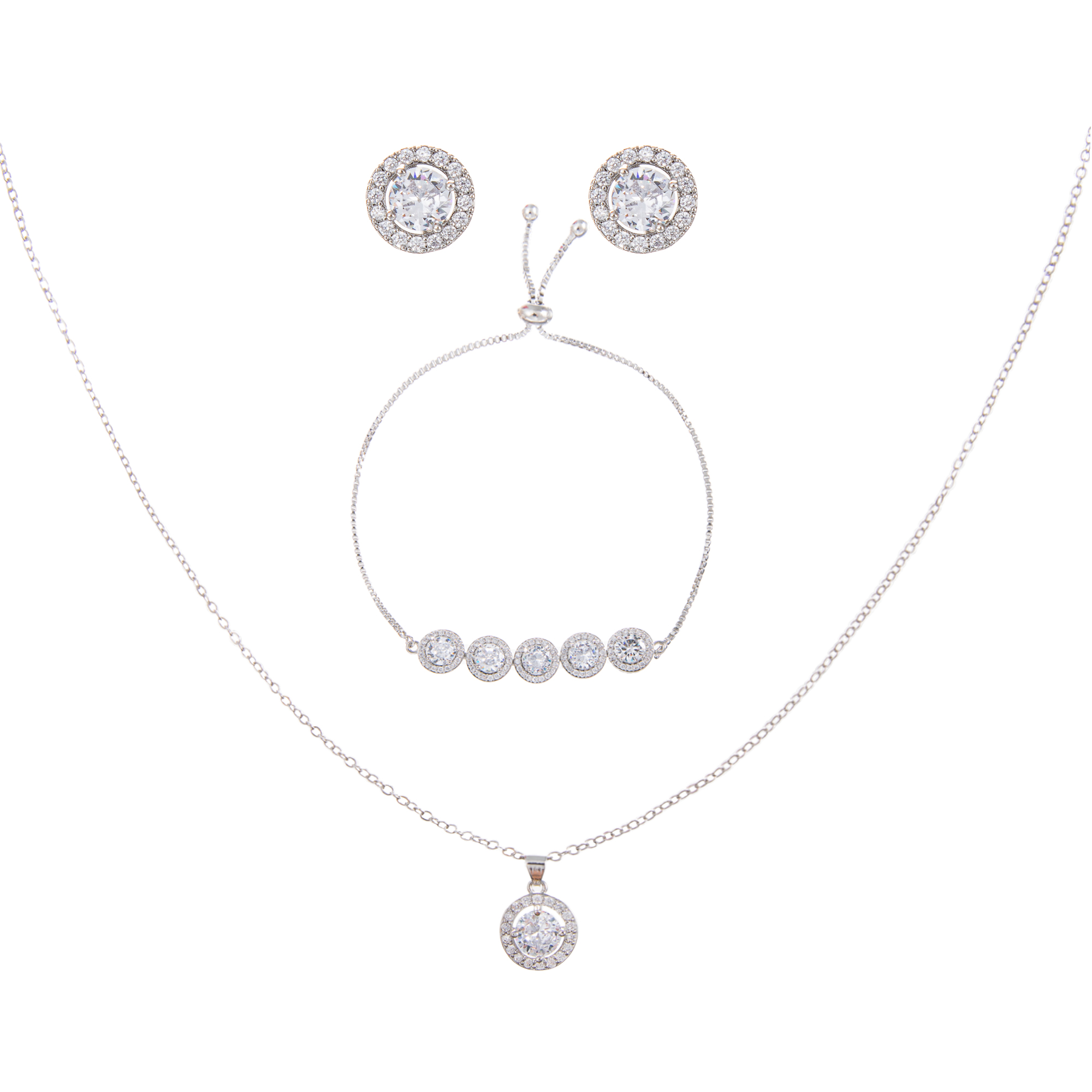 Our Silver Crystal Round Cubic Zirconia 3pc Set is delicately crafted and designed to complement any outfit, whether you’re dressing up for a night out on the town or adding some glamour to your everyday style. The necklace and bracelet can be worn separately for a more subtle look or paired together for a bold and eye-catching ensemble.