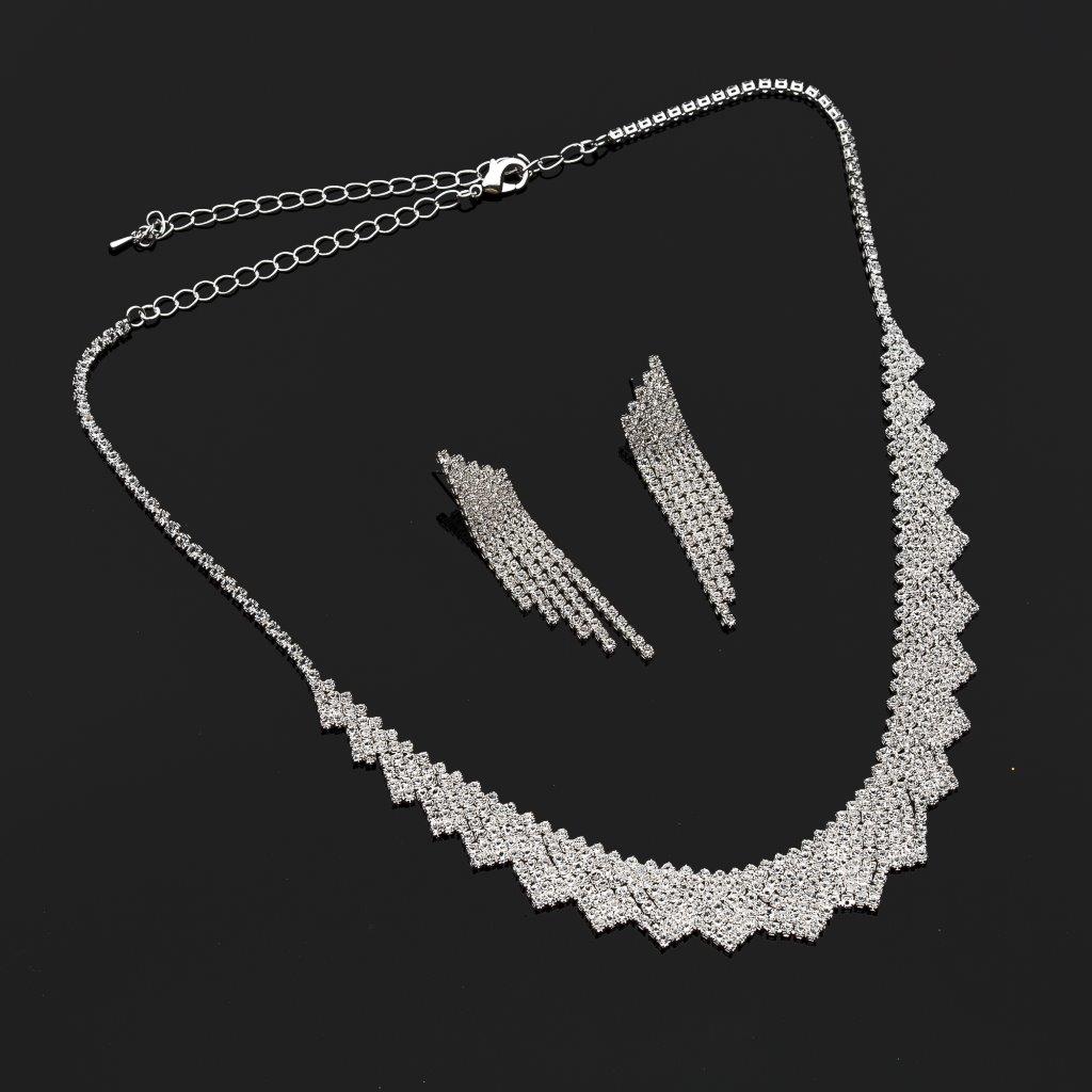 Embrace your inner diva as you strut your stuff in this stunning necklace and earring set. This exquisite jewelry set is perfect for those who want to make a statement and leave a lasting impression. The silver crystals and rhinestones adorning this set will have heads turning and jaws dropping wherever you go.
