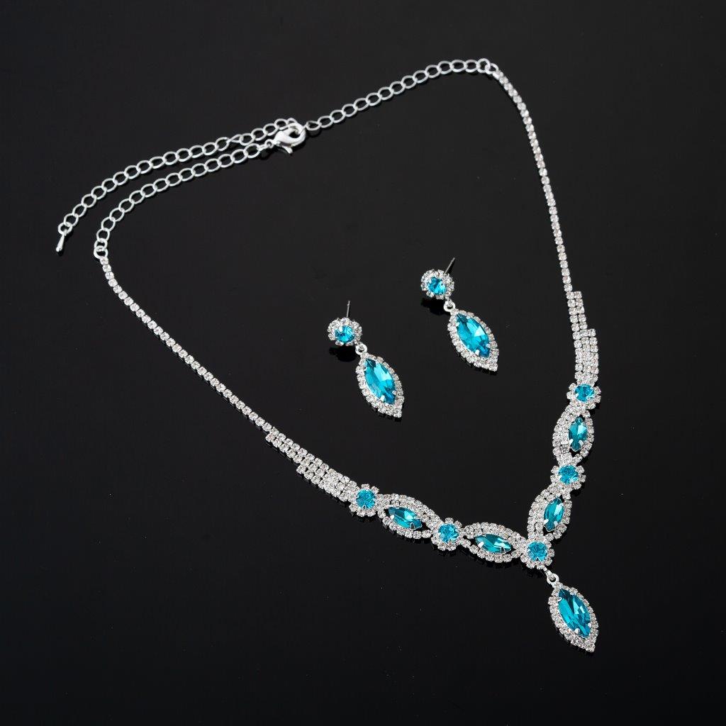 With its beautiful aqua color, this necklace and earring set will surely catch everyone’s attention. Made with high-quality rhinestones and silver, it exudes an air of luxury and sophistication.