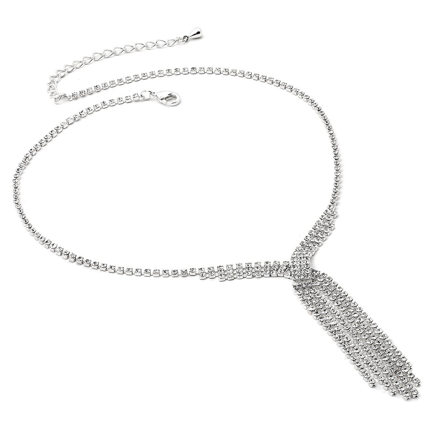 This necklace is stunning! It is encrusted with clear, sparkling rhinestones along a silver plate. The necklace measures approximately 16″ long with a 3.0″ extender chain for just the right fit. It is perfect for weddings, proms, formals, parties, pageants, and more. It coordinates with any color or style wedding dress or formal ensemble.