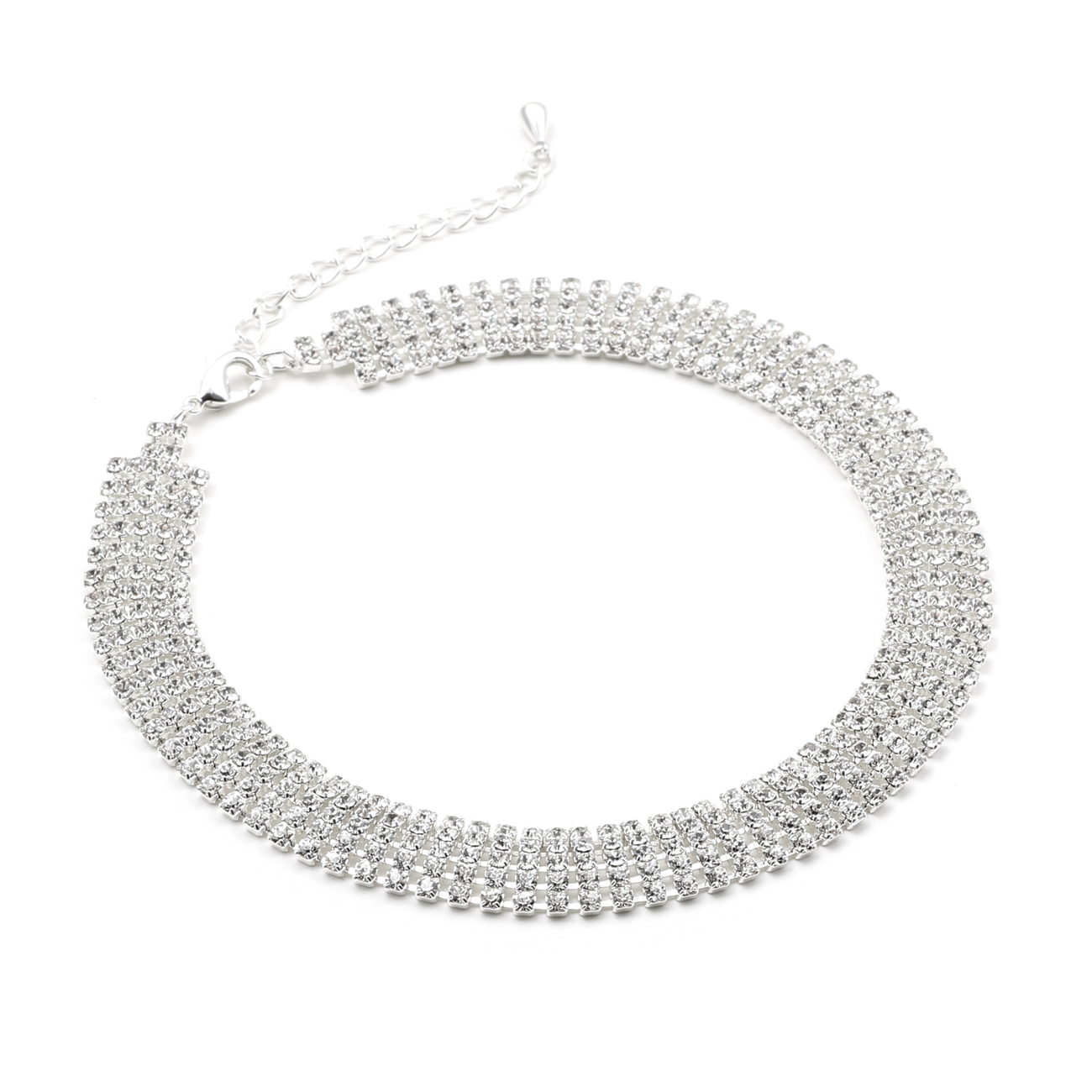 This necklace is stunning! It is encrusted with clear, sparkling rhinestones along a silver plate. The necklace measures approximately 12″ long with a 3″ long extender chain for just the right fit. It is perfect for weddings, proms, formals, parties, pageants, and more. It coordinates with any color or style wedding dress or formal ensemble.