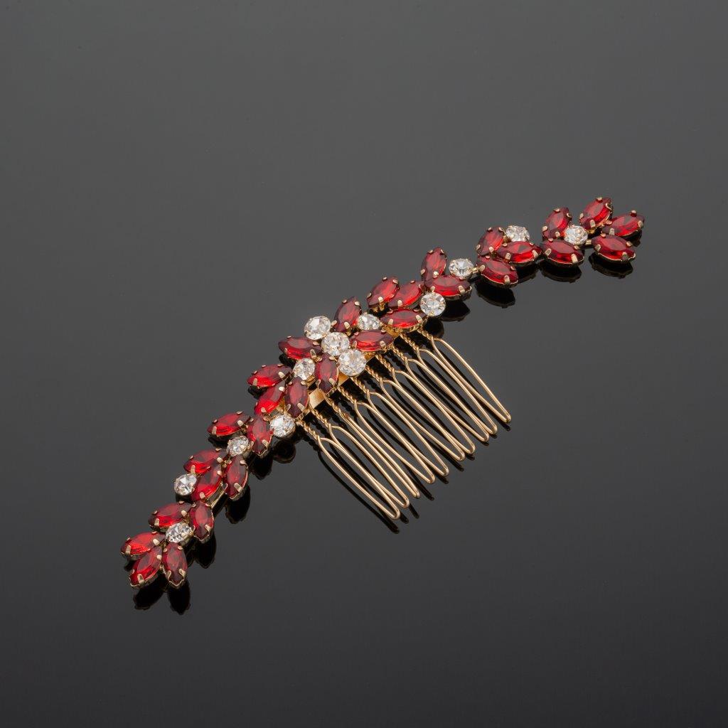Featuring mesmerizing crystals in a striking Siam red hue, this hair accessory will add a touch of glamour to any hairstyle. Its gold accents and rhinestones beautifully complement the crystals, creating a dazzling piece that demands attention.