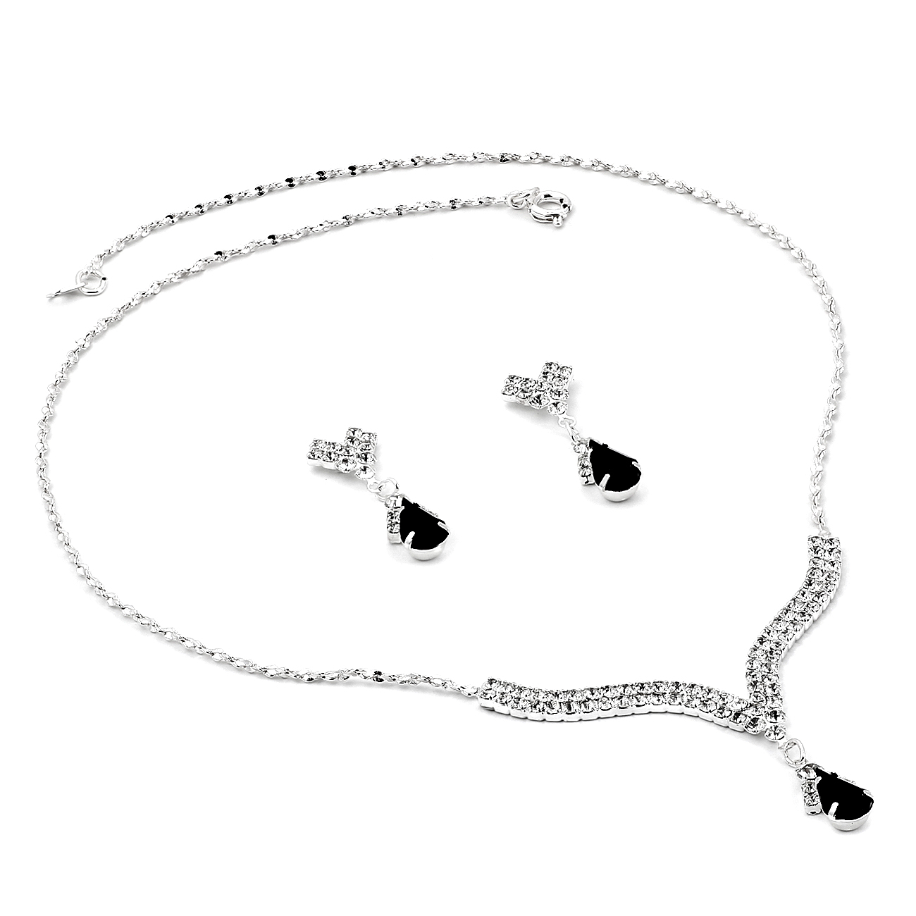 Silver Jet Rhinestone Necklace with Jet Teardrop Center & Matching Dangle Earrings Jewelry Set