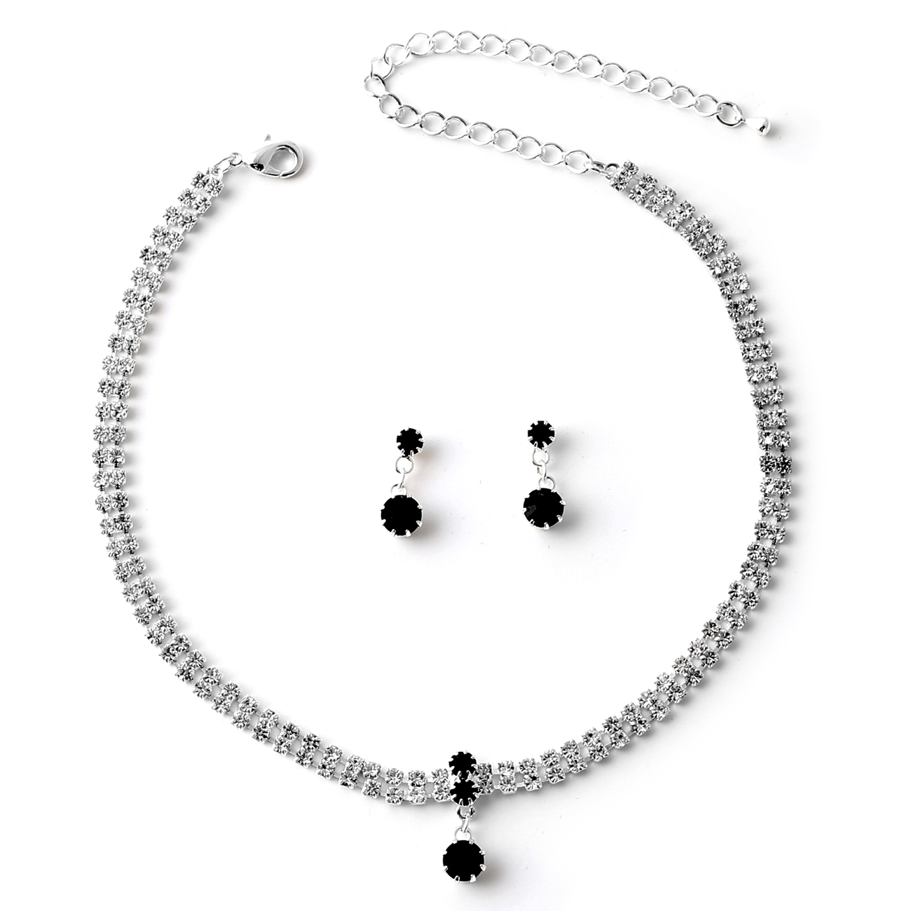 Silver Crystal Rhinestone with Dangle Circle Jet Stone Necklace and Dangle Jet Stone Earrings Jewelry Set