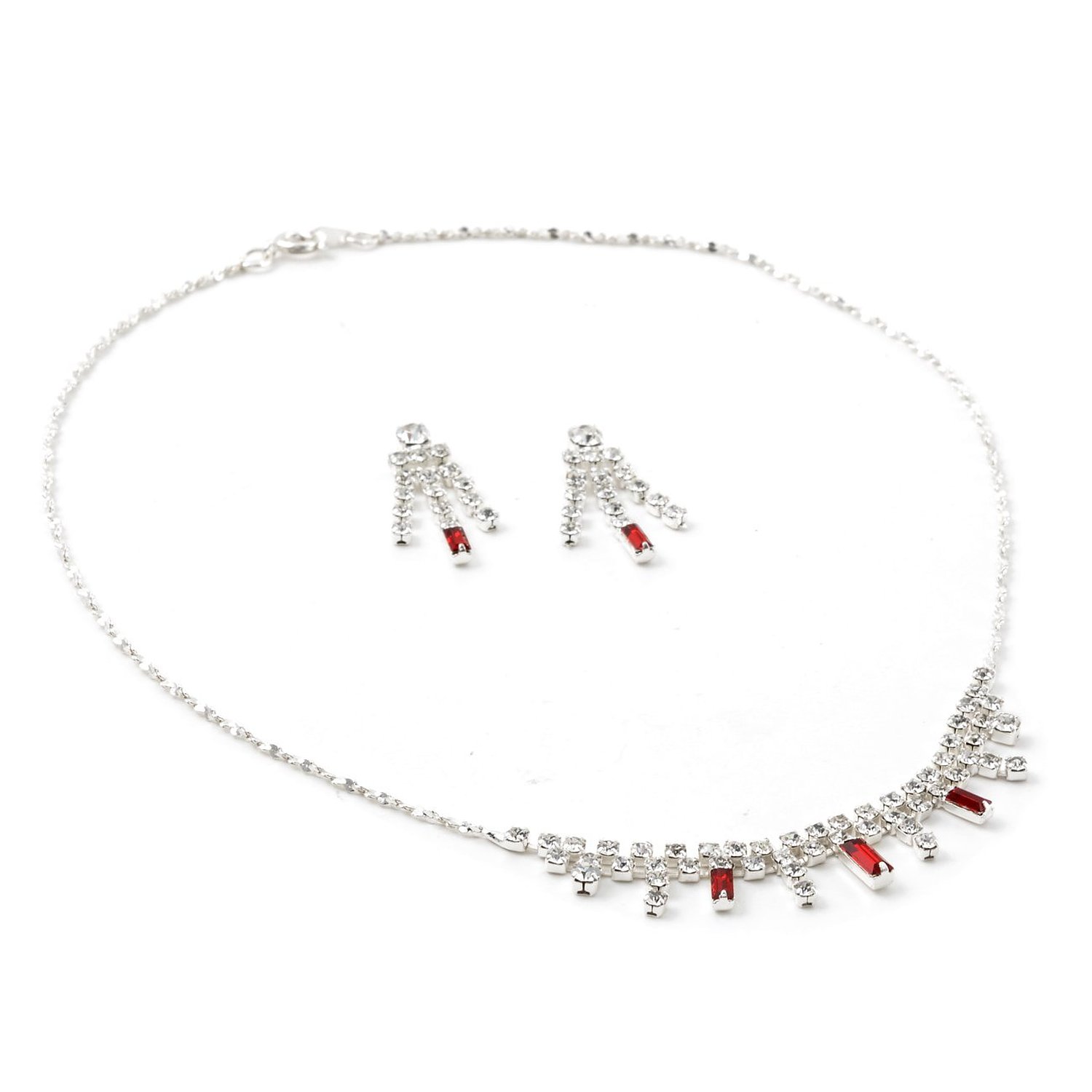 Silver Crystal with Siam Rhinestone Accent Center Necklace & 3 Strand Dangle Earrings Jewelry Set