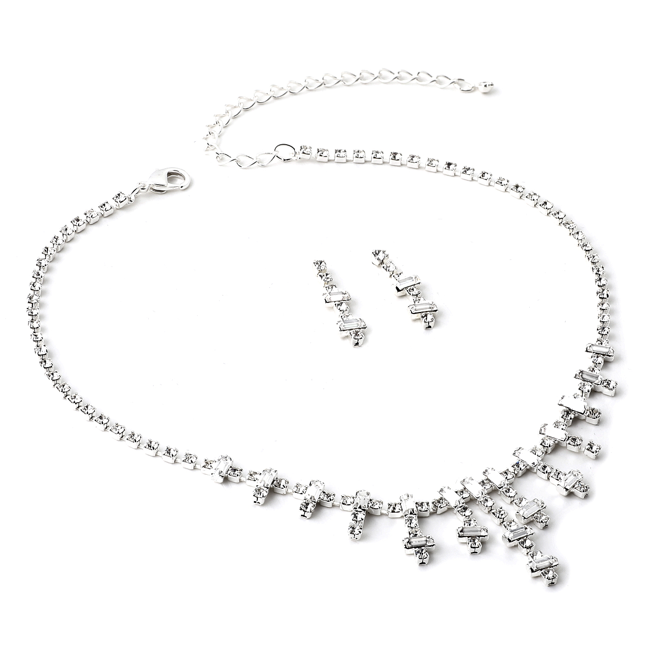 Silver Crystal Dangle Baguette Necklace Set