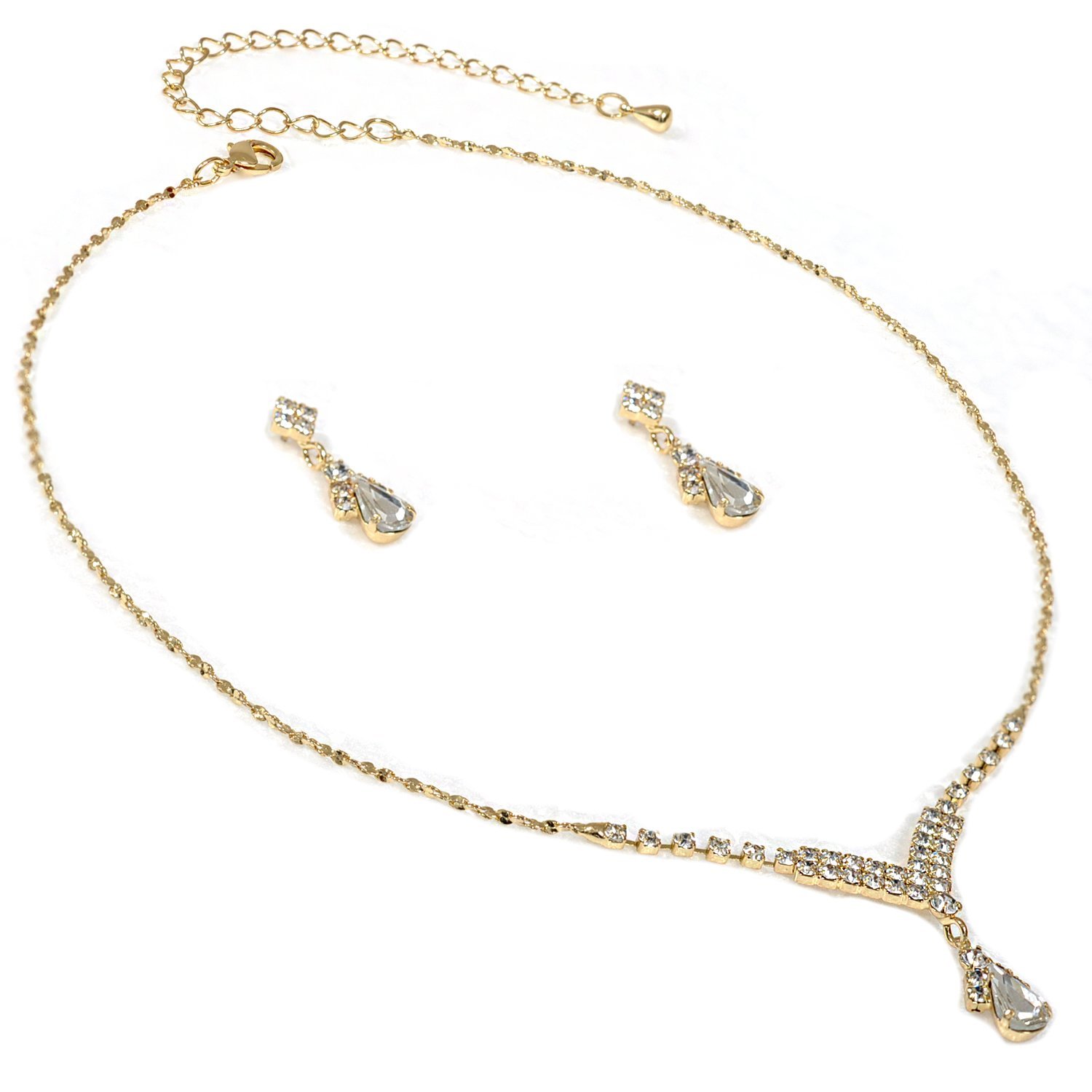 Gold Crystal Teardrop Dangle Earrings V Shape Necklace Jewelry Set