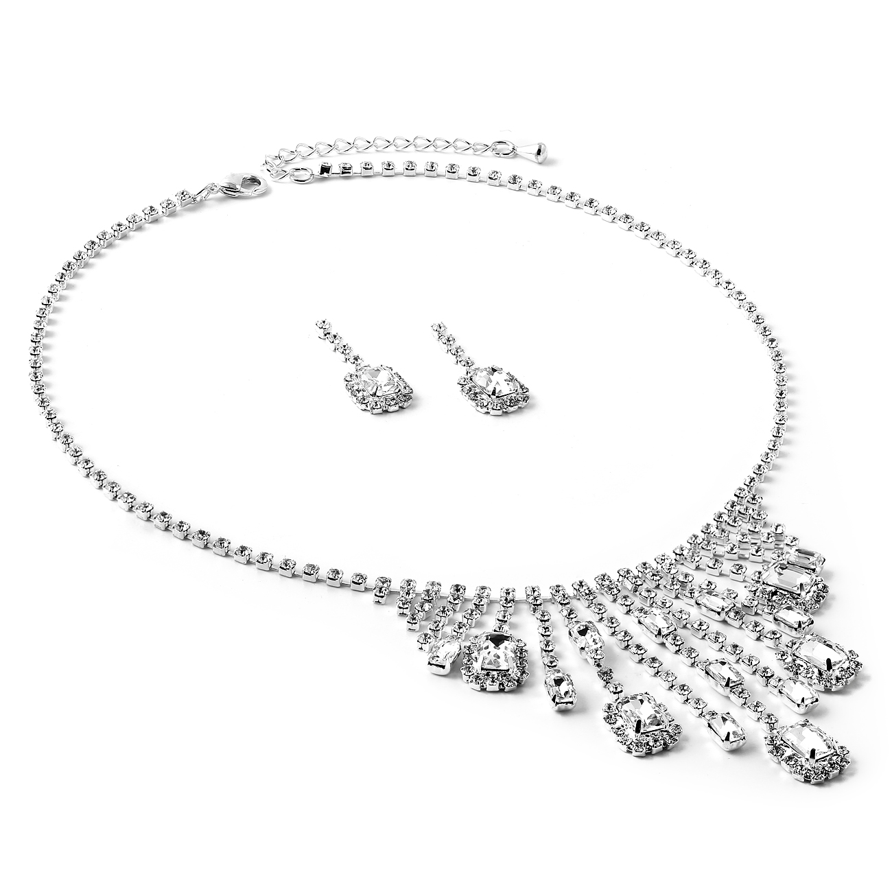 Silver Crystal Rhinestone with Dangle Square Crystal Stones Necklace and Matching Dangle Earrings Jewelry Set