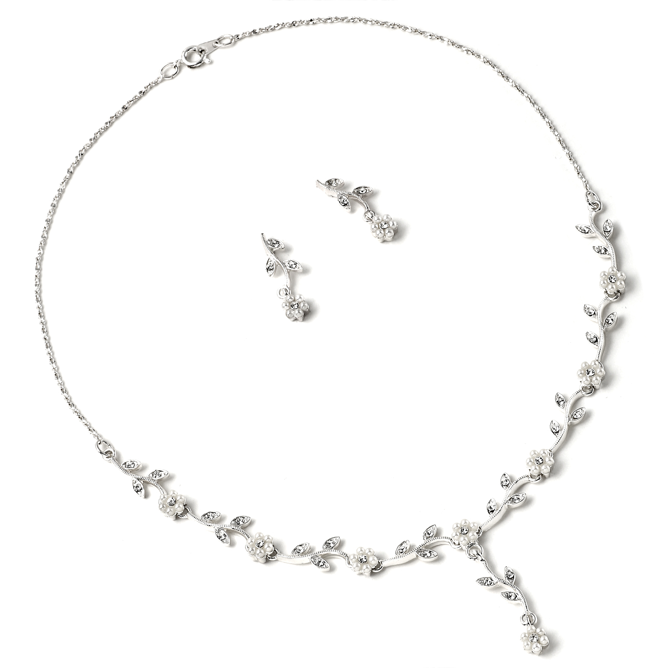 Silver Crystal Flower Shape White Pearl with Branch Leaf Shape Rhinestone Necklace & Matching White Pearl Dangle Earrings Jewelry Set