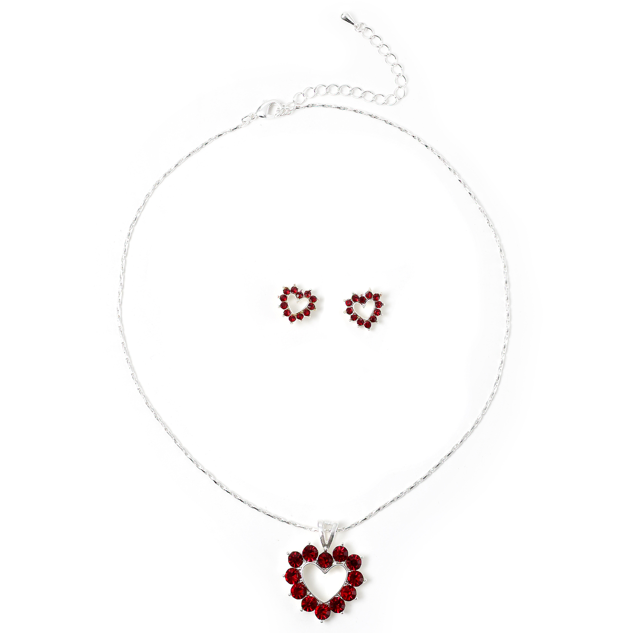 Silver Siam Thin Line with Open Heart Shape Rhinestone Center Piece Necklace & Matching Stud Earrings Jewelry Set