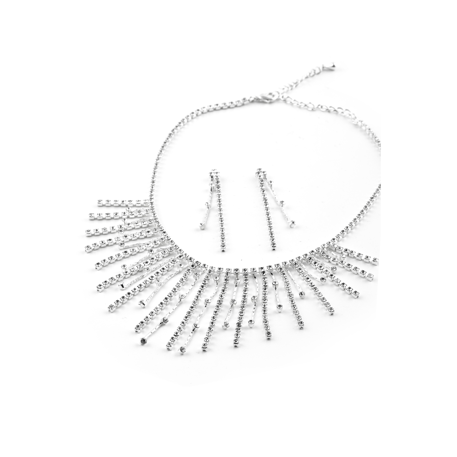 Introducing the dazzling Silver Crystal Alternating Strands Dangle 15″ Necklace with Dangle 2.5″ Earrings Jewelry Set, specially designed to make heads turn and jaws drop! This exquisite necklace set falls gracefully into the Necklace Sets category, showcasing its mesmerizing blend of elegance and glamour.