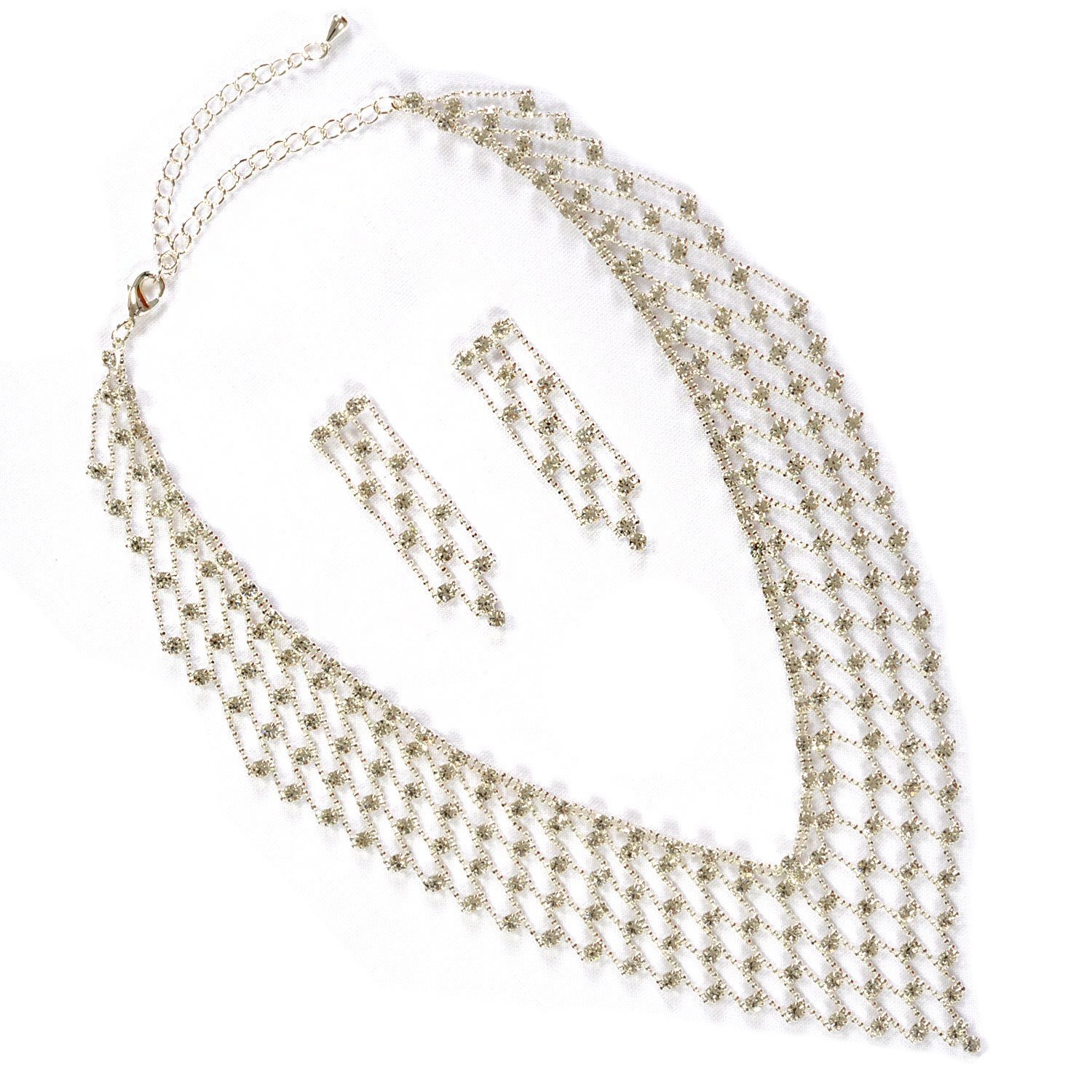 Silver Crystal Rhinestone V Shape Tennis Net Style Necklace Matching Dangle Earrings Jewelry Set