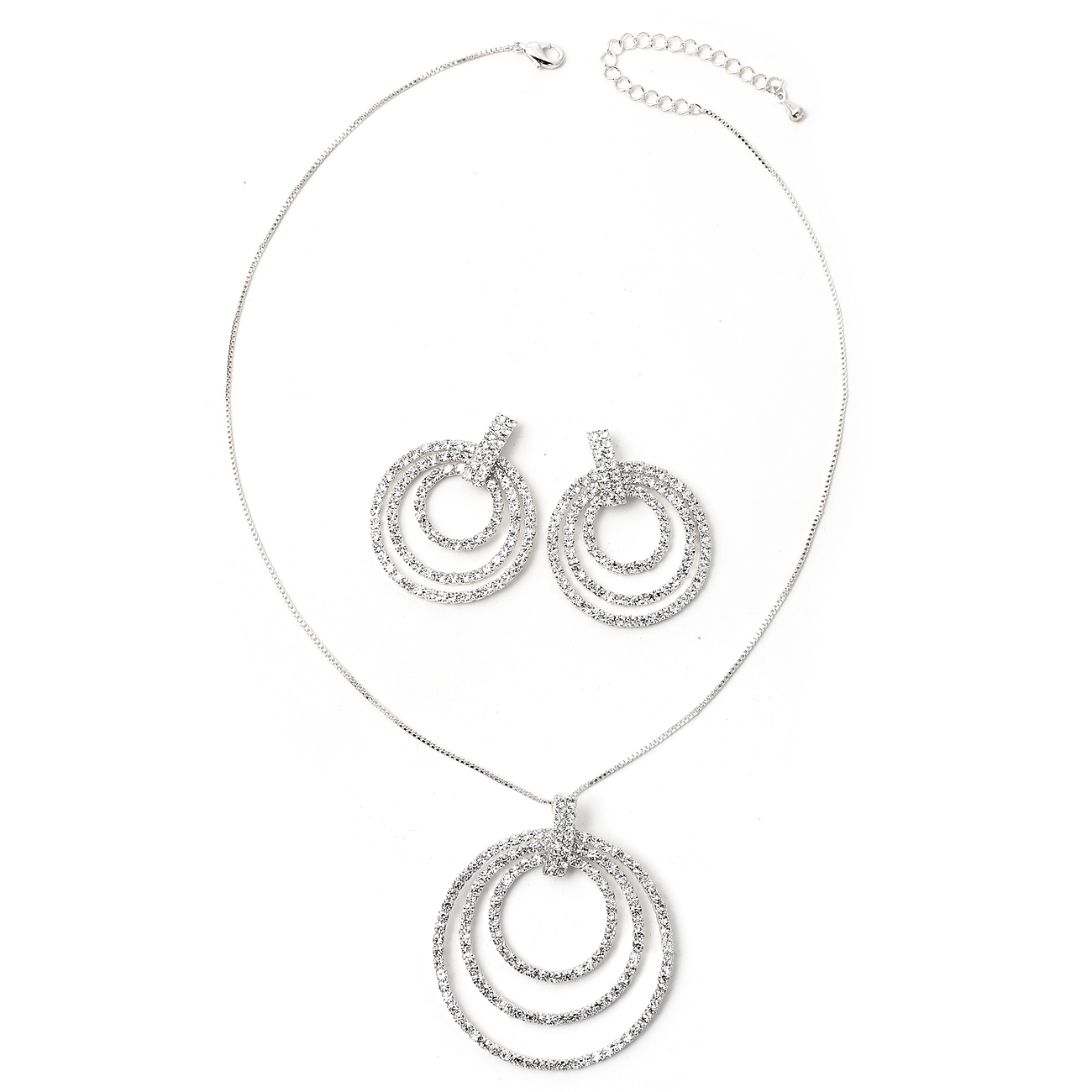 Silver Crystal Rhinestone 3 Layer Round Shape Ring Center Piece Necklace & Matching Dangle Earrings Jewelry Set