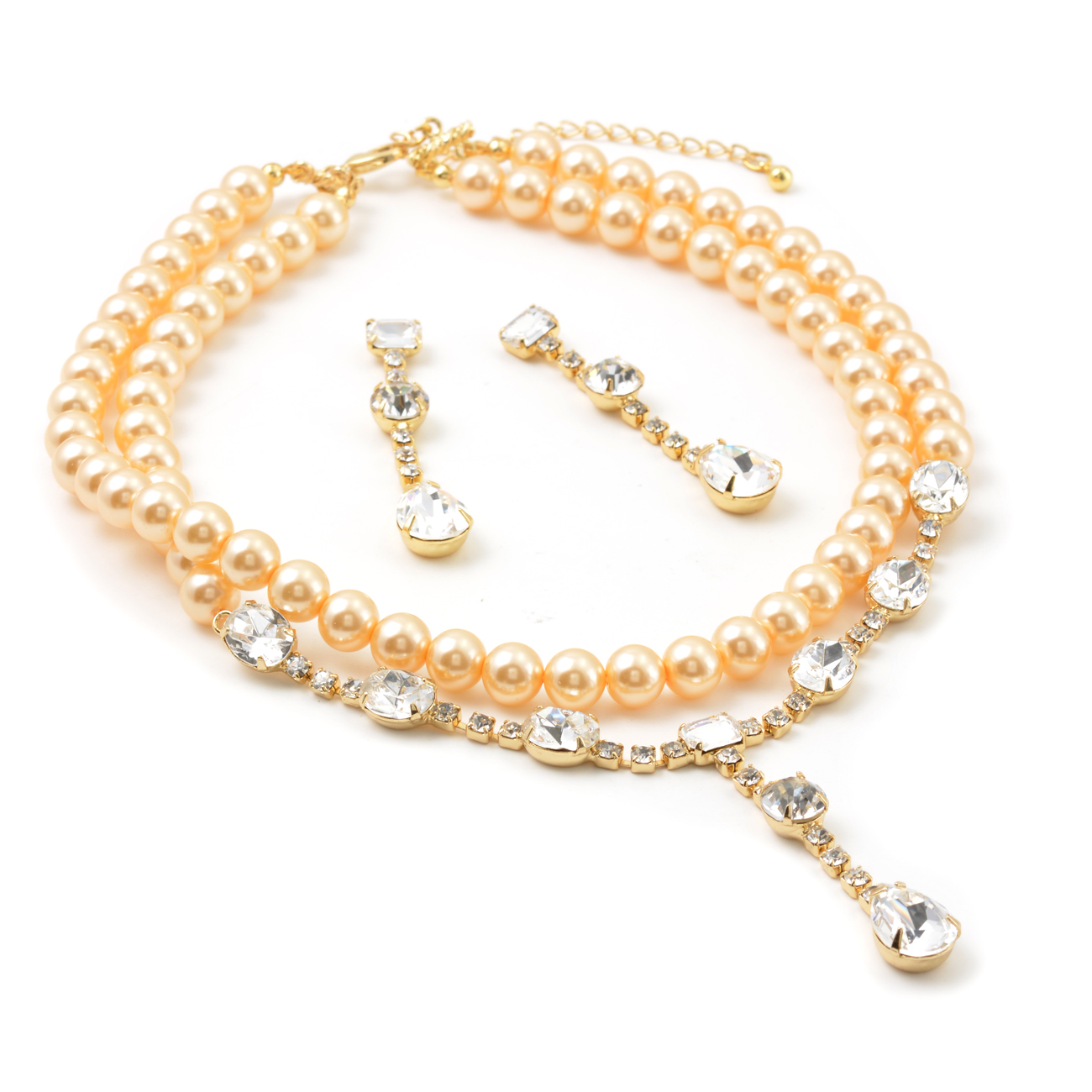 This jewelry set is stunning! This lovely necklace is completed with matching earrings. It is encrusted with clear, sparkling rhinestones and pearls along a gold plate. The necklace measures approximately 14″ long with a 3″ long extender. The matching earrings measure 2.25″ long and 4.1g in weight. It is perfect for weddings, proms, formals, parties, pageants, and more. It coordinates with any color or style wedding dress or formal ensemble.