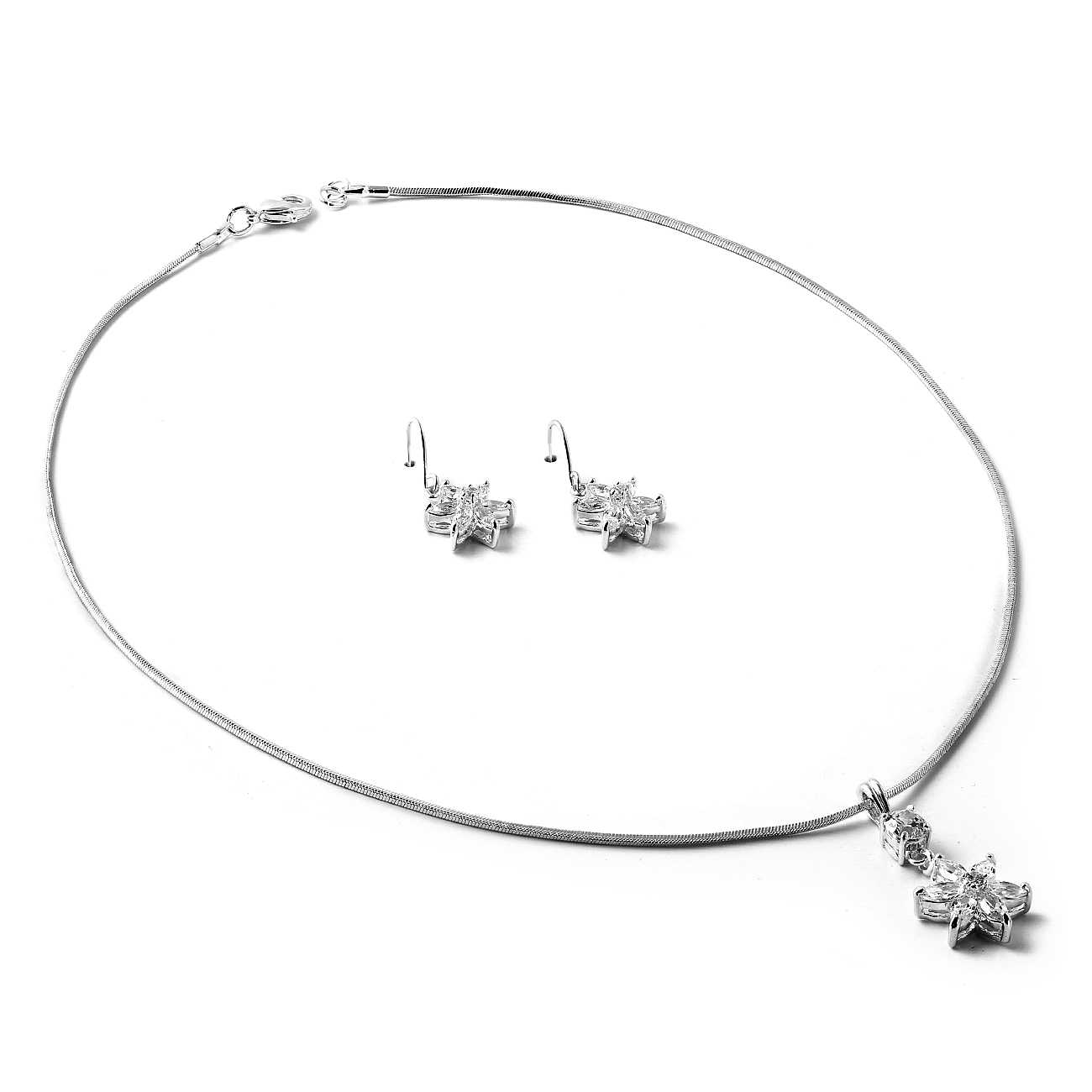 Silver Twist Chain with Dangle Crystal Cubic Zirconia 6 Point Flower Necklace and Matching Wire Earrings Jewelry Set
