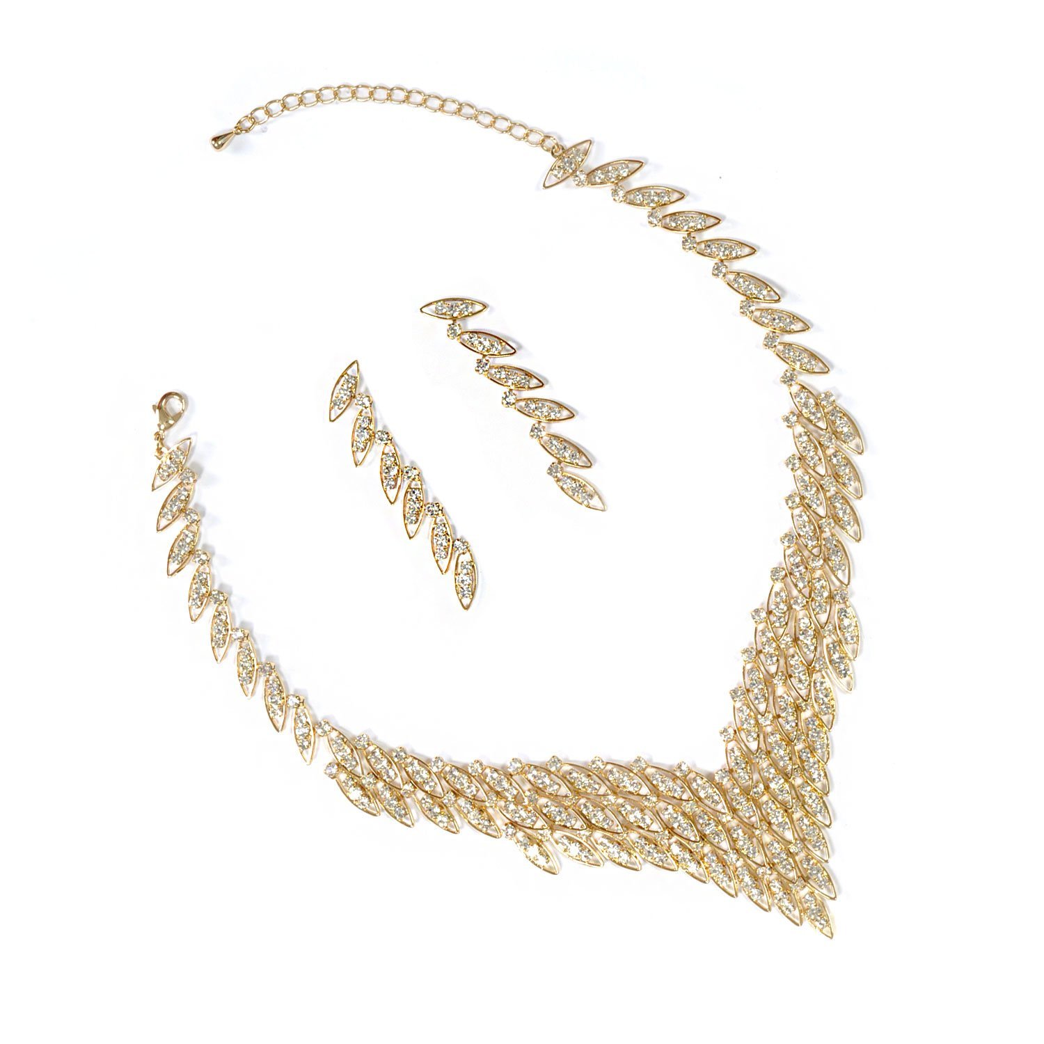 Why wait? Add a little pizzazz to your wardrobe with our (71781-200) Gold Crystal Rhinestone 3 Rows V Shape Necklace And Matching Dangle Earrings Jewelry Set today!