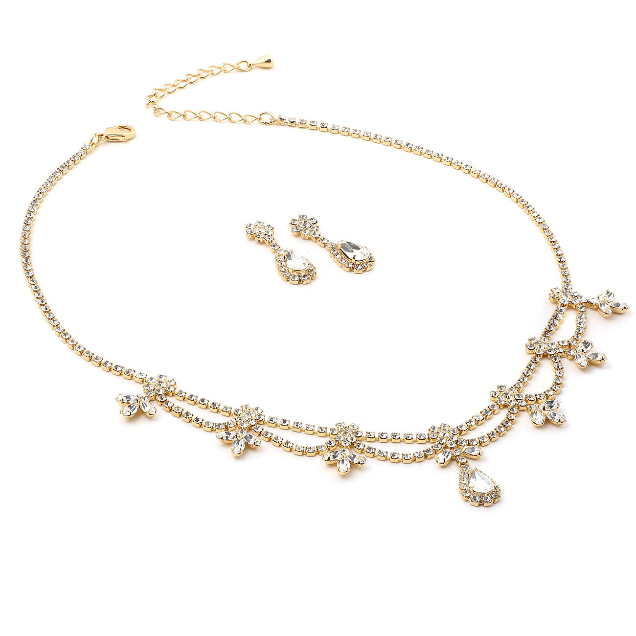 Gold Crystal Rhinestone Flower Necklace and Matching Dangle Earrings Jewelry Set