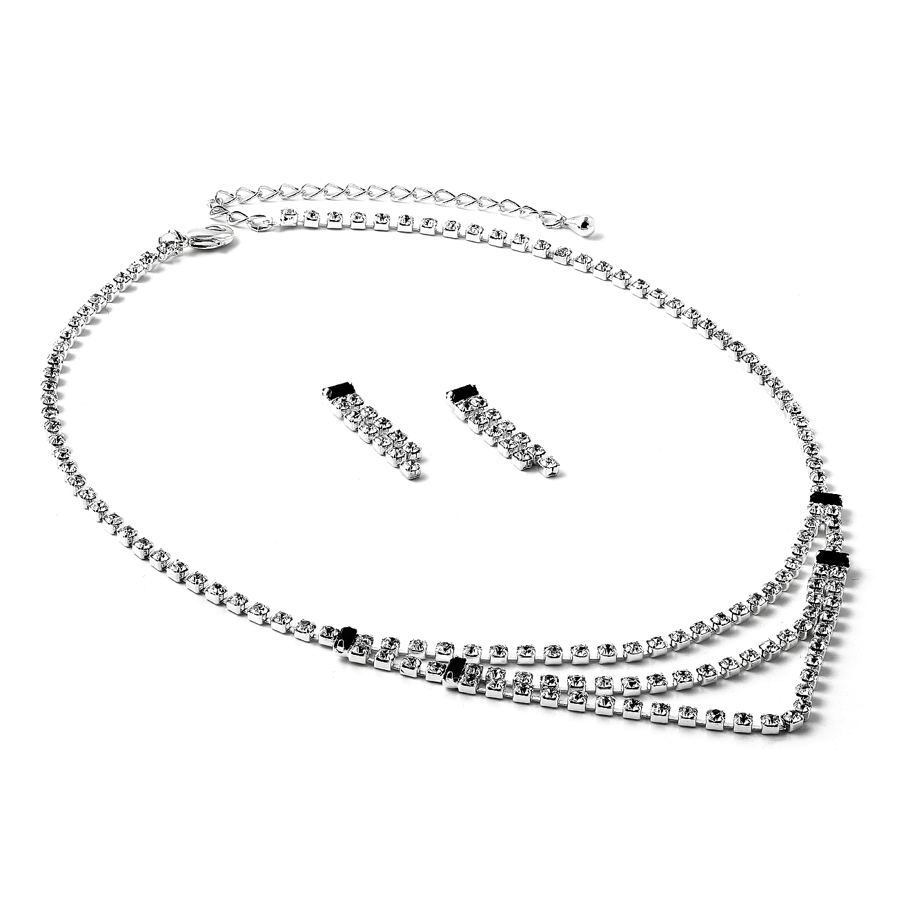 Silver Crystal Rhinestone and Jet Baguette 3 Line V Neck Necklace and Matching Dangle Earrings Jewelry Set