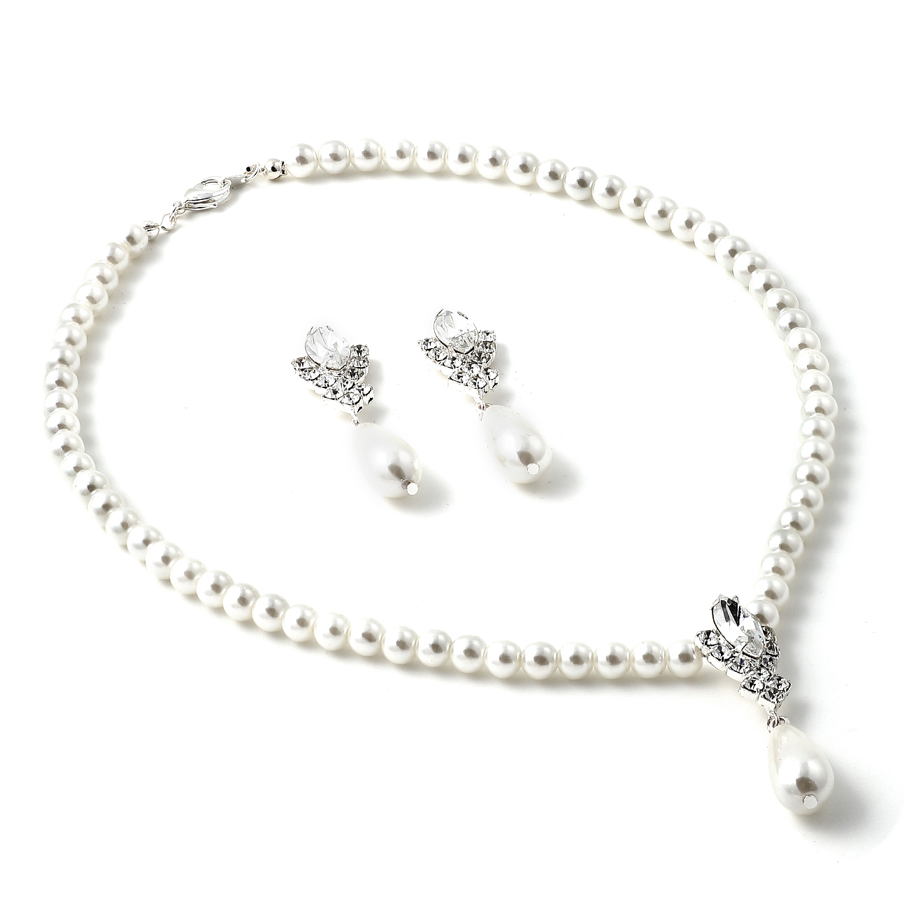 Silver White Pearls Necklace with Crystal Rhinestone and Dangle White Pearl Centerpiece & Matching Dangle Earrings Jewelry Set