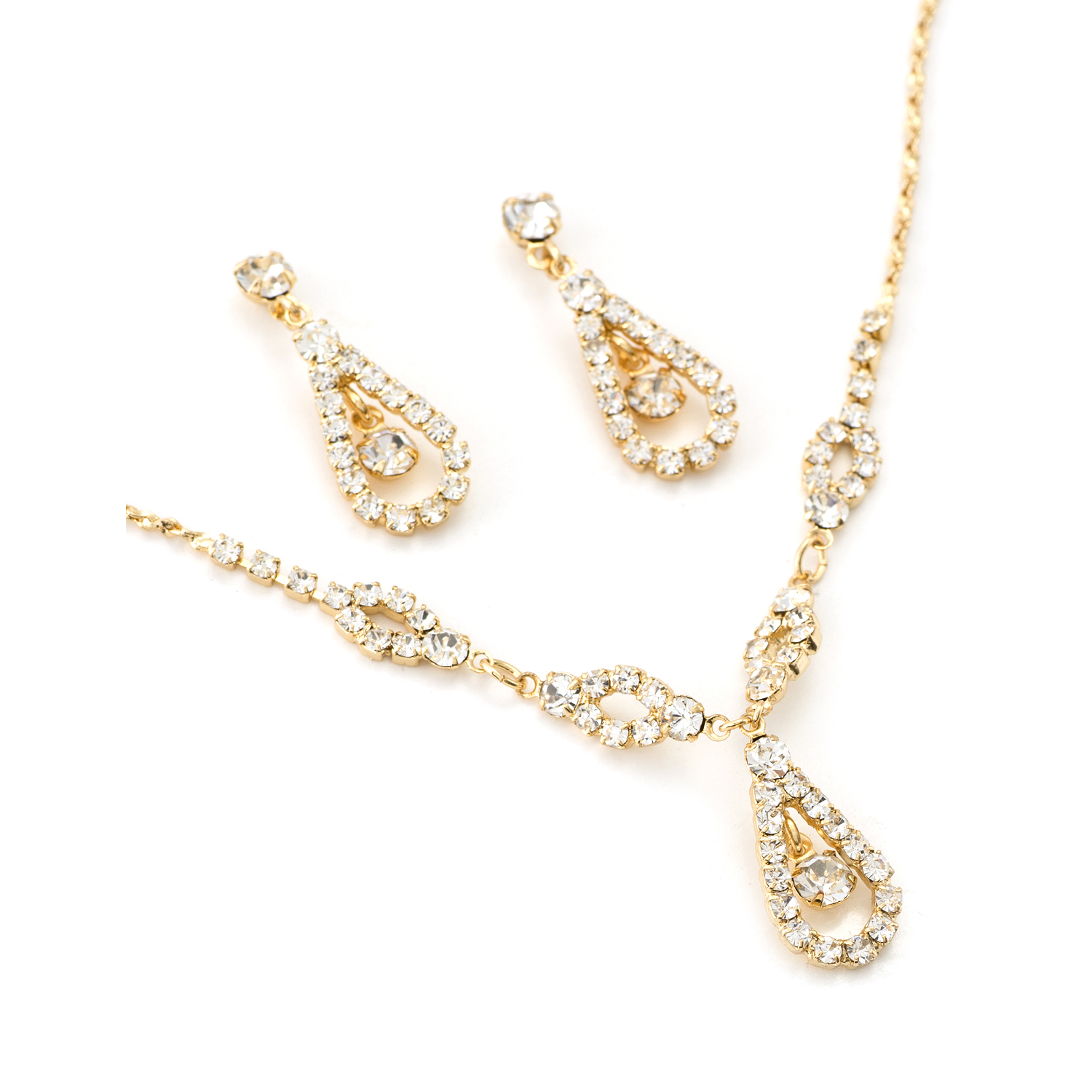 Gold Teardrop Shape Line with Crystal Rhinestone Fill Bridal Wedding Party Necklace and Matching Dangle Earrings Jewelry Set