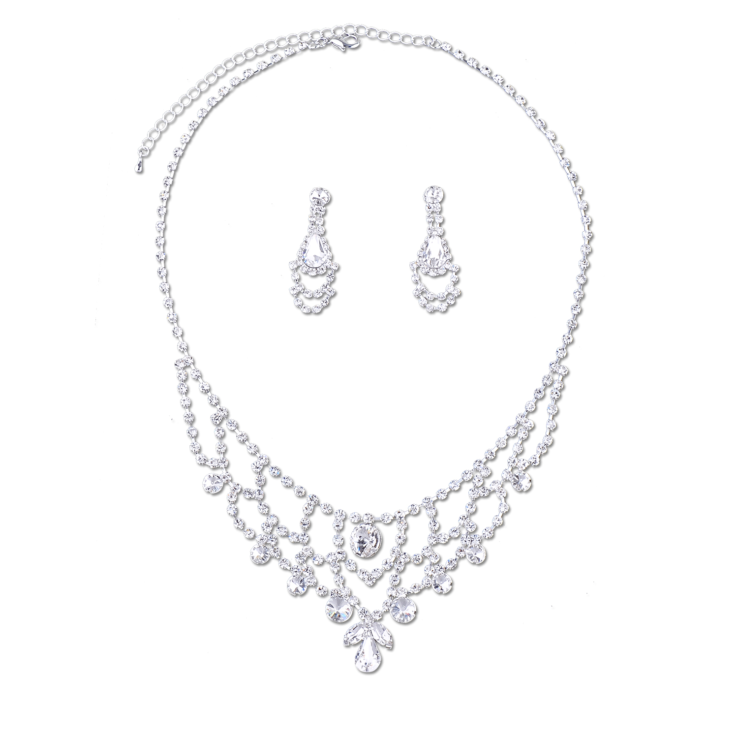 Silver Crystal Rhinestone Chandelier with Teardrop Rhinestone Necklace & Matching Teardrop Pear Shape Dangle Earrings Jewelry Set