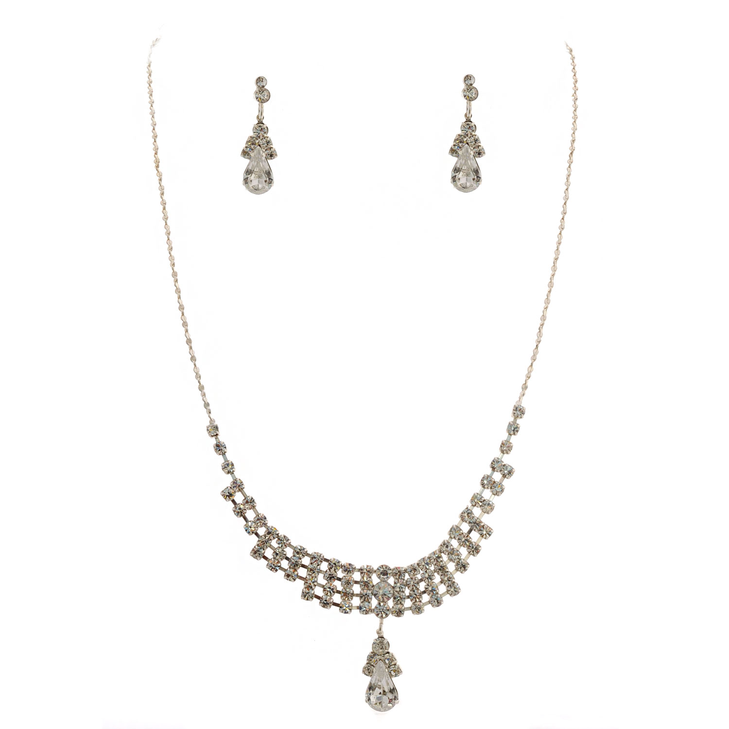 Wedding Jewelry Set Silver Crystal Teardrop Necklace Dangle Earrings Set