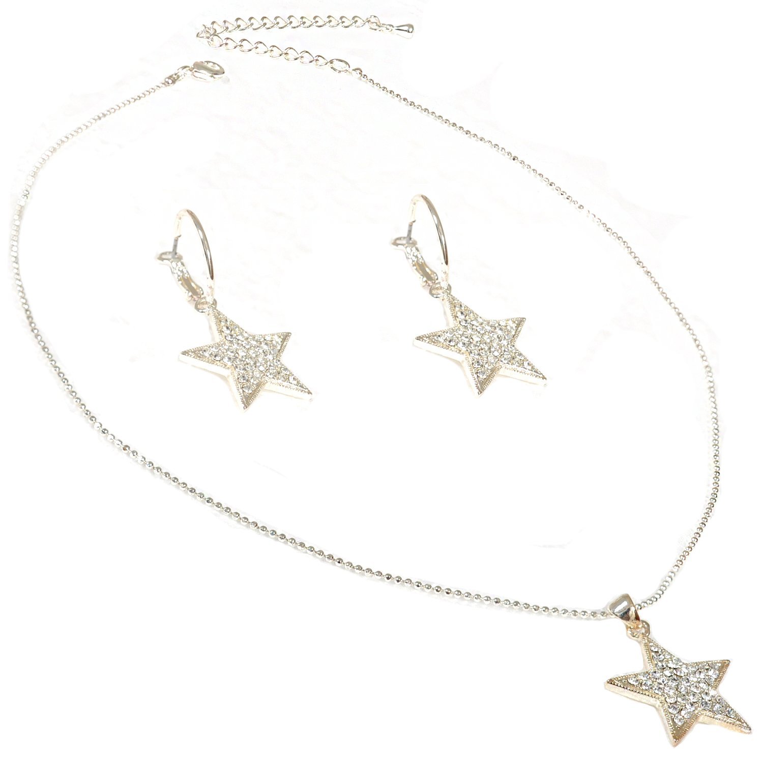 Silver Crystal Rhinestone Star Shape Necklace & Matching Dangle Earrings Jewelry Set