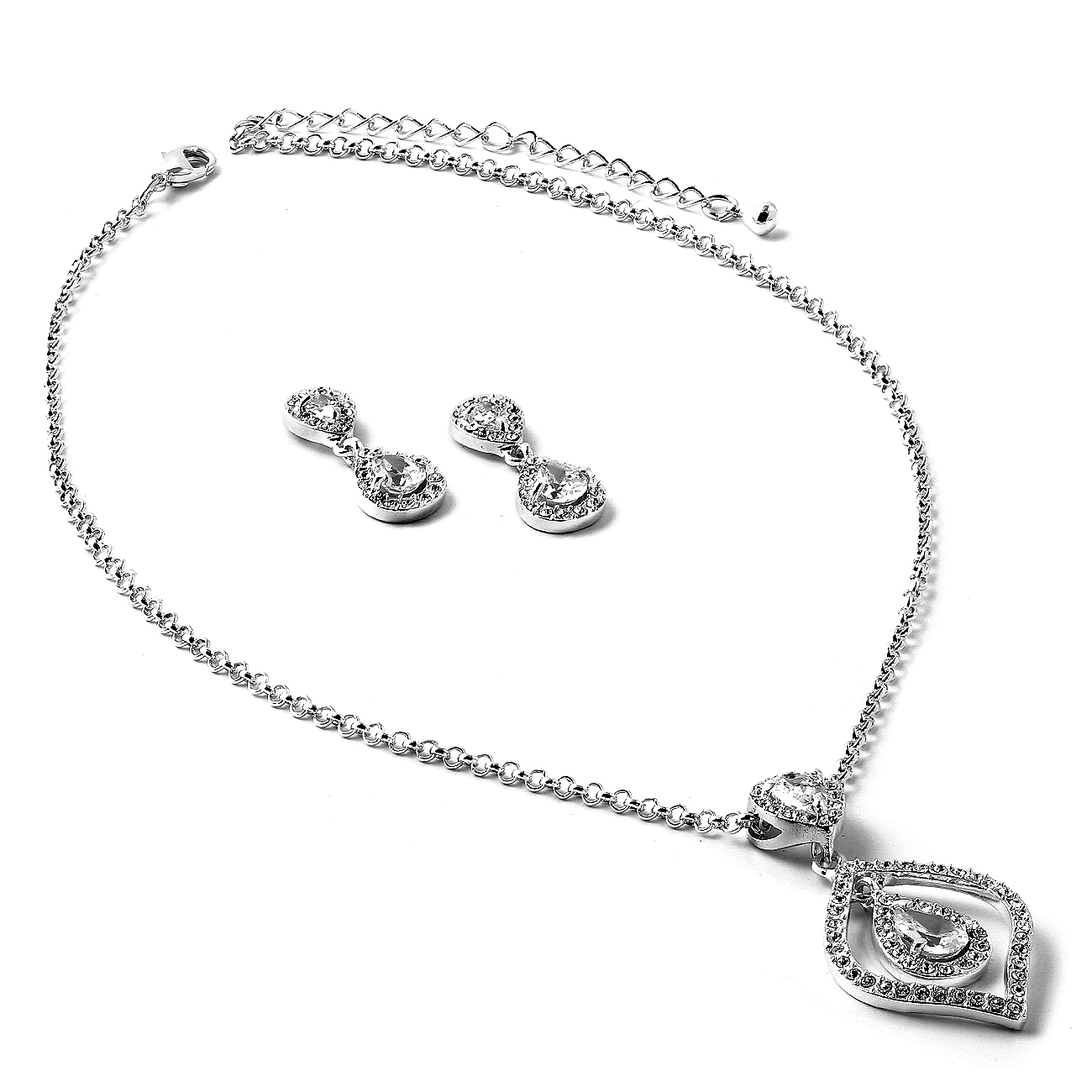 Silver 16 inch Cuff Link Chain with Crystal Teadrop Stone and Rhinestones Around Centerpiece Necklace and Matching Dangle Earrings Jewelry Set