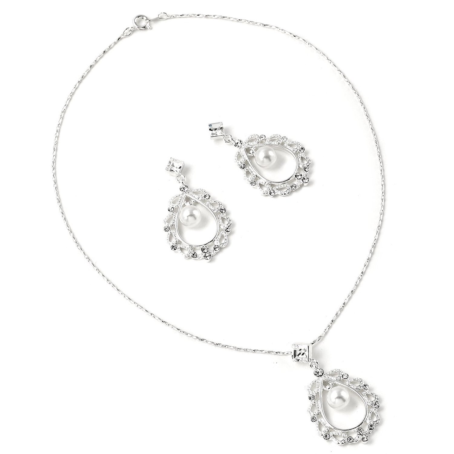 Silver Crystal Teardrop Pear Shape Rhinestone Inside White Pearl Dangle Thin Chain Necklace & Matching Dangle Earrings Jewelry Set