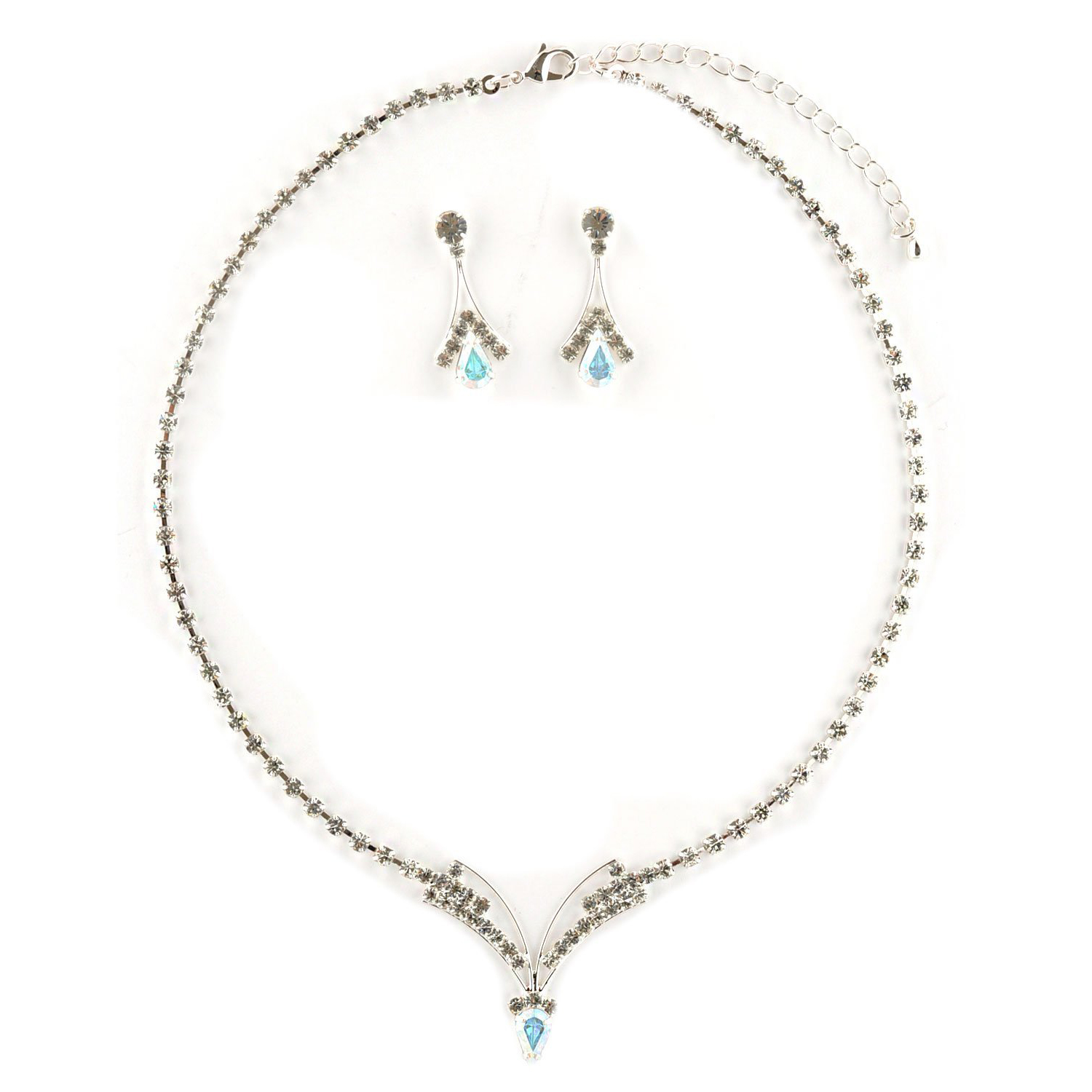 Jewelry Set V Necklace Stud Earrings Crystal Rhinestone Silver Aurora Borealis Pear