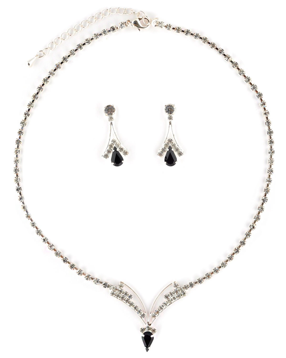 Jewelry Set V Necklace Stud Earrings Crystal Rhinestone Silver Jet Pear