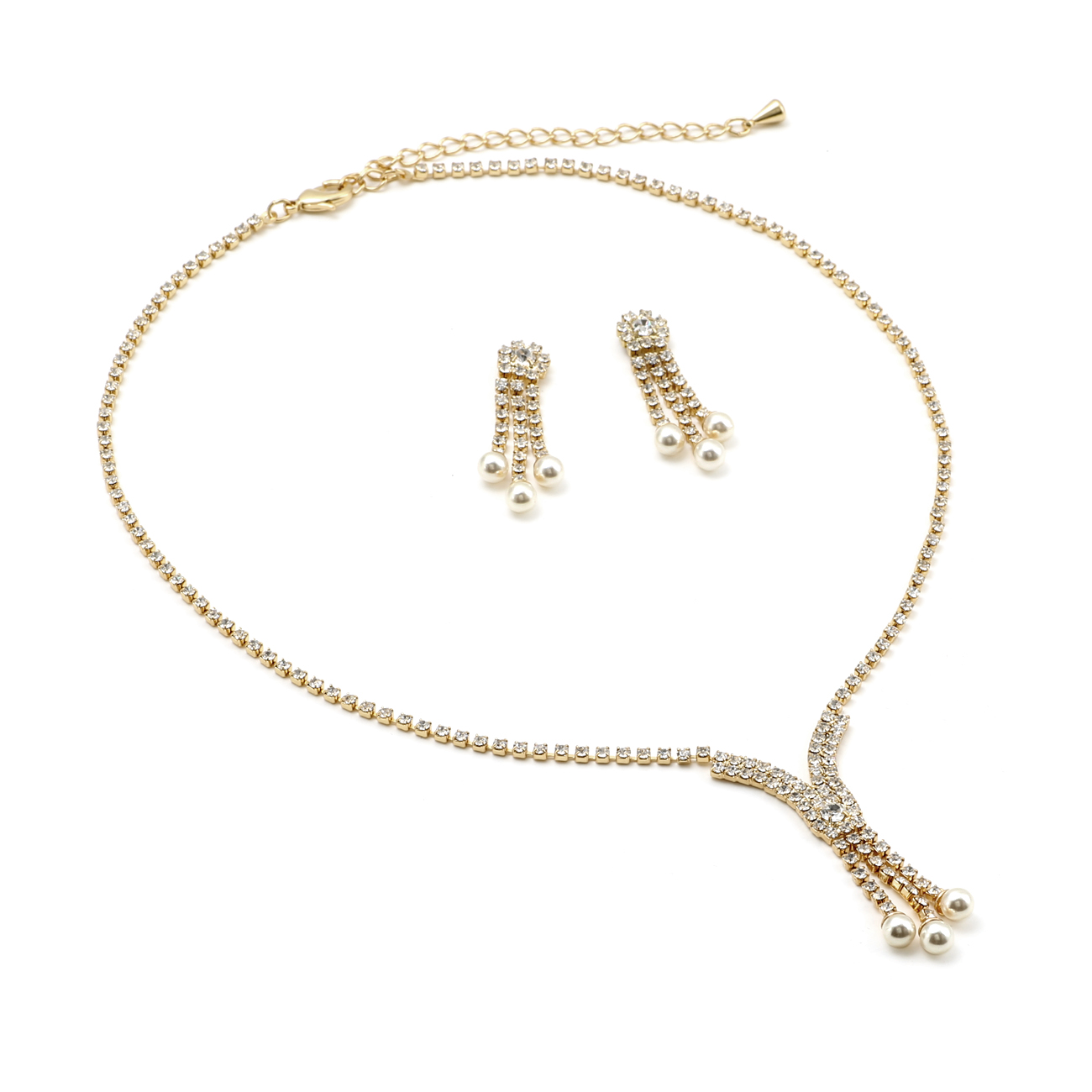Introducing our latest jewelry sensation, the Gold Crystal Small Y-type with 3 Strand Cream Faux Pearl Necklace with Dangle Earrings Jewelry Set! This exquisite set is a true treasure for any fashionista who wants to add a touch of elegance and luxury to their ensemble.
