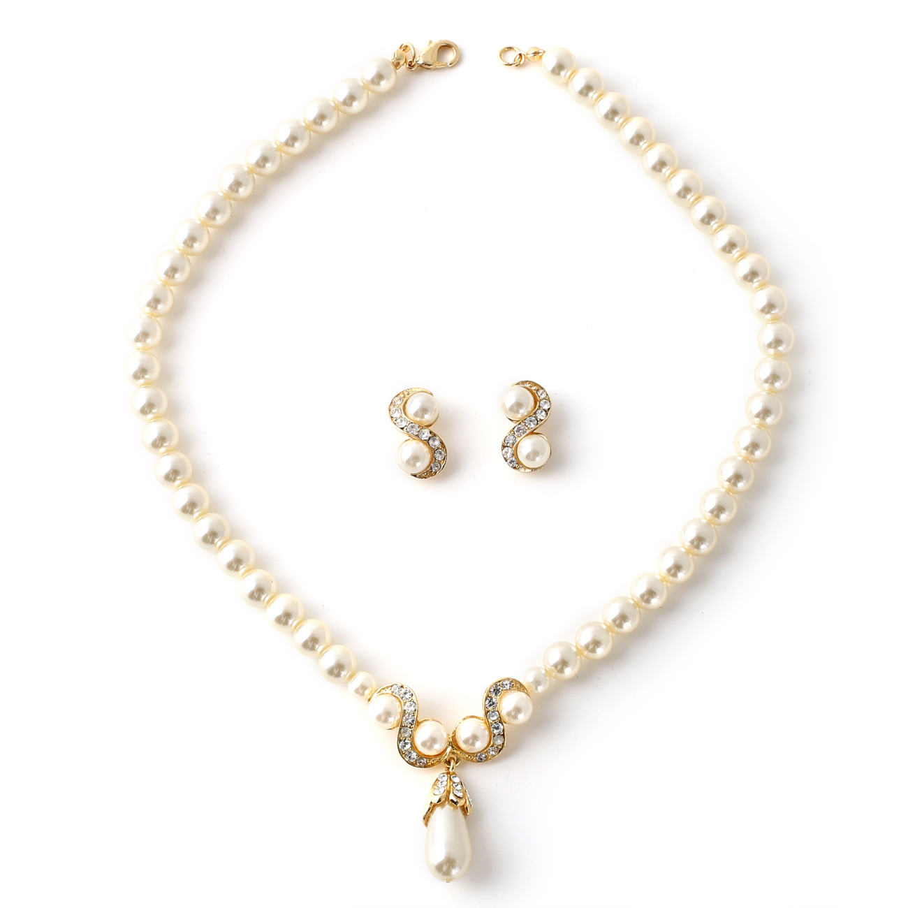 Gold Cream Pearl Chain and Crystal Rhinestone Necklace Earrings Jewelry Set
