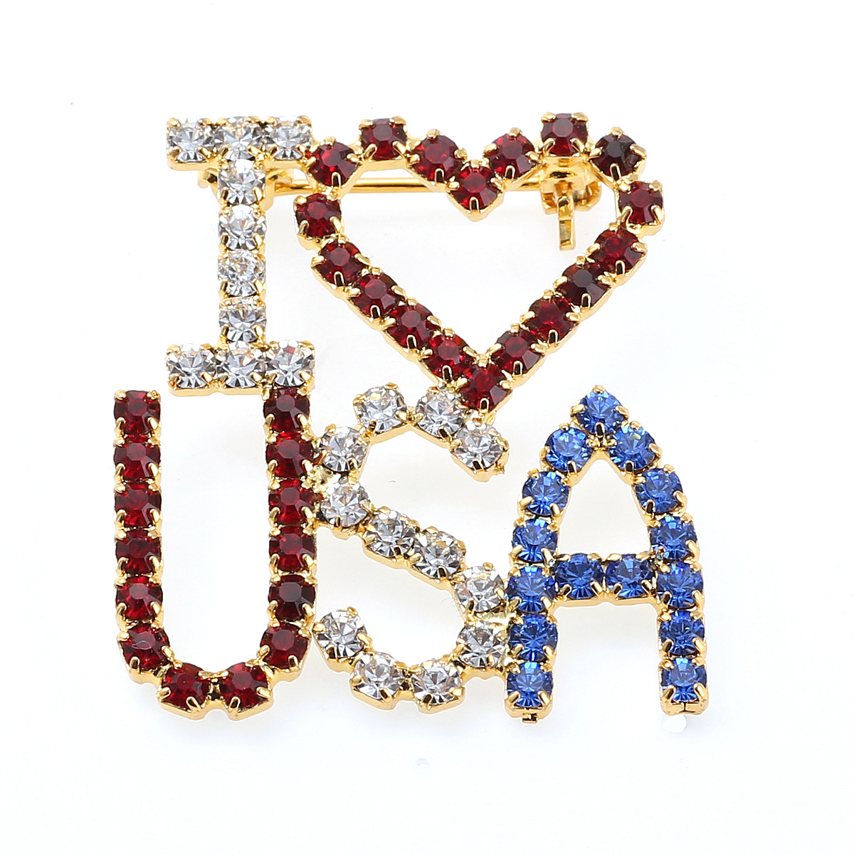 This gold crystal rhinestone studded Heart USA pin will represent a patriotism for America. This pin brooch will be loved by all loving this country people.